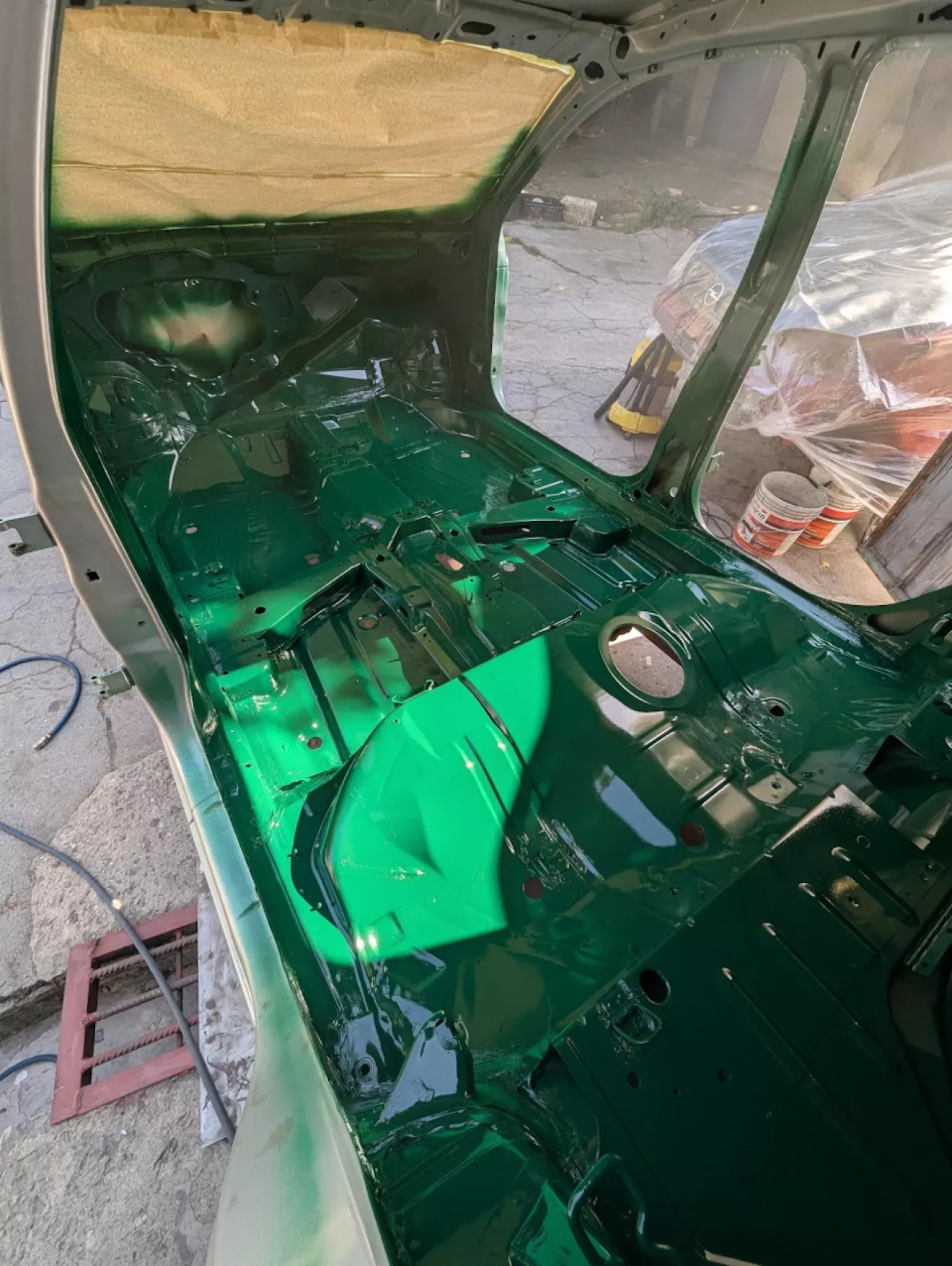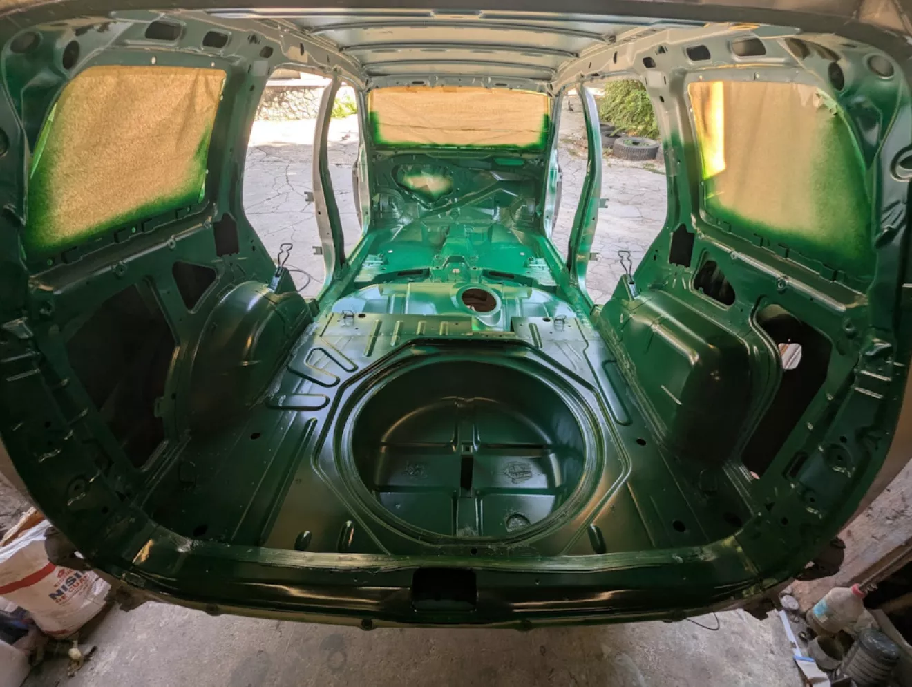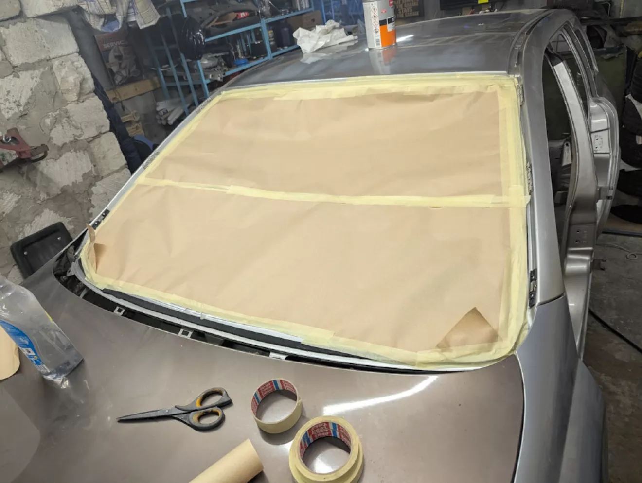 Поснимал все клипсы, оставшиеся от прошлого владельца, и подготовил кузов к покраске. Заклеил лобовое, чтобы не загадить морду, и боковые стёкла тоже.