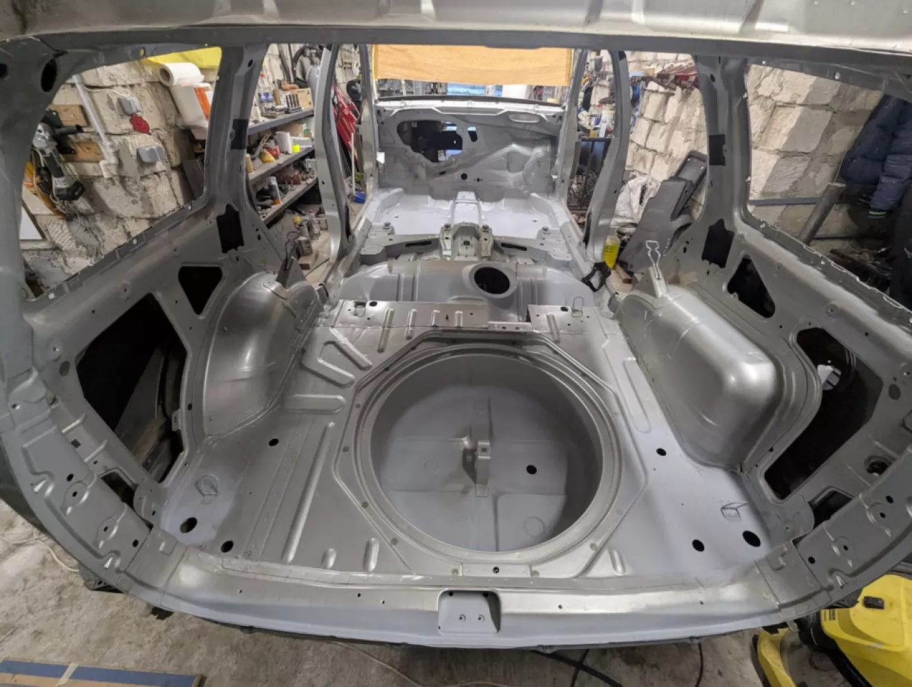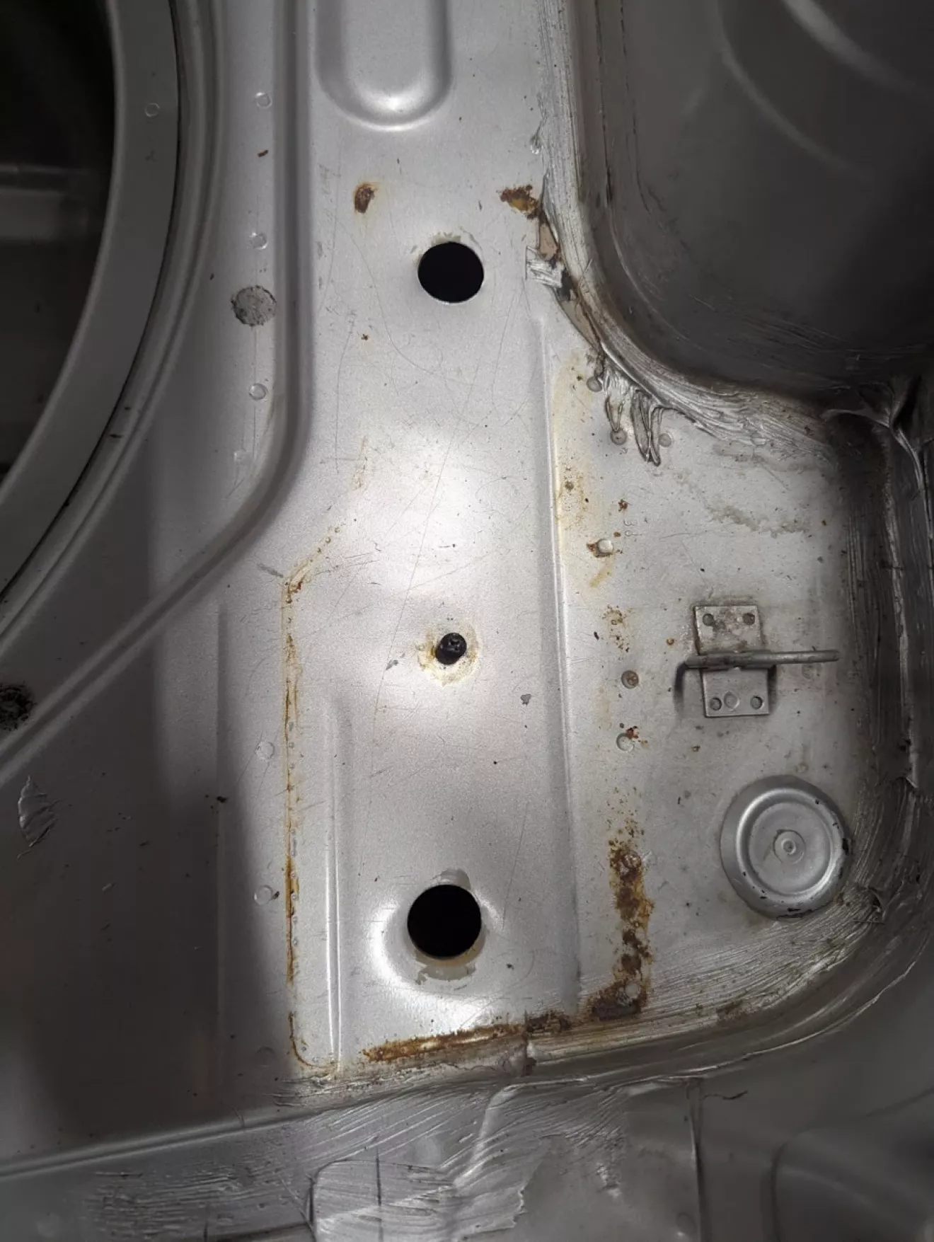 Сзади осталось одно место, где когда-то вылезли рыжики. Честно, так и не понял, откуда они там взялись — вроде просто отверстия под болты фаркопа, но как это связано с коррозией, ума не приложу. В любом случае зачистил всё абразивным кругом на пневмомашинке и прошёл эпоксидным грунтом.