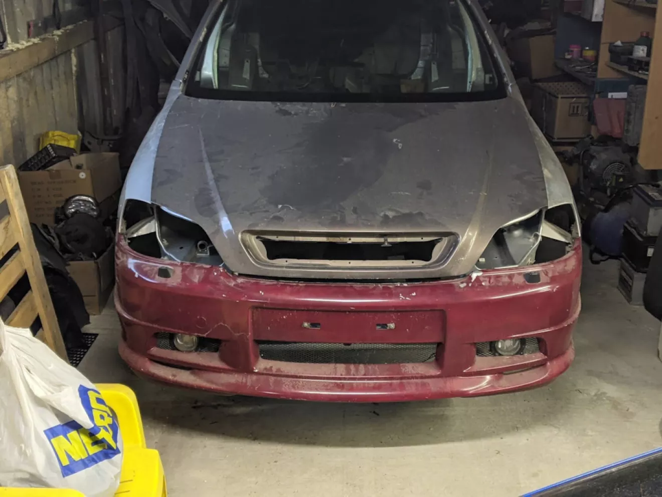 И вот с тех пор было мне обещанно что когда он его снимет с машины то обязательно продаст его мне, и вот настал момент когда у него машина устала и стукнул мотор, и всё с неё самое лучшее было снято и отвезена на металлолом, а бампер и другие ништяки перешли ко мне. Был он привезен на красной Астре, так как места было очень мало, и ставить его в багажник было невозможно.