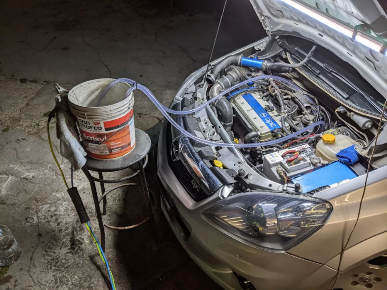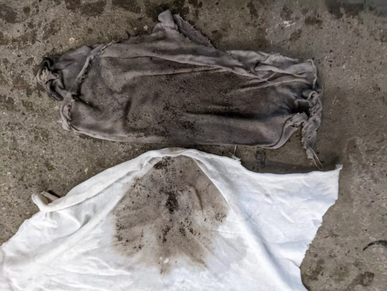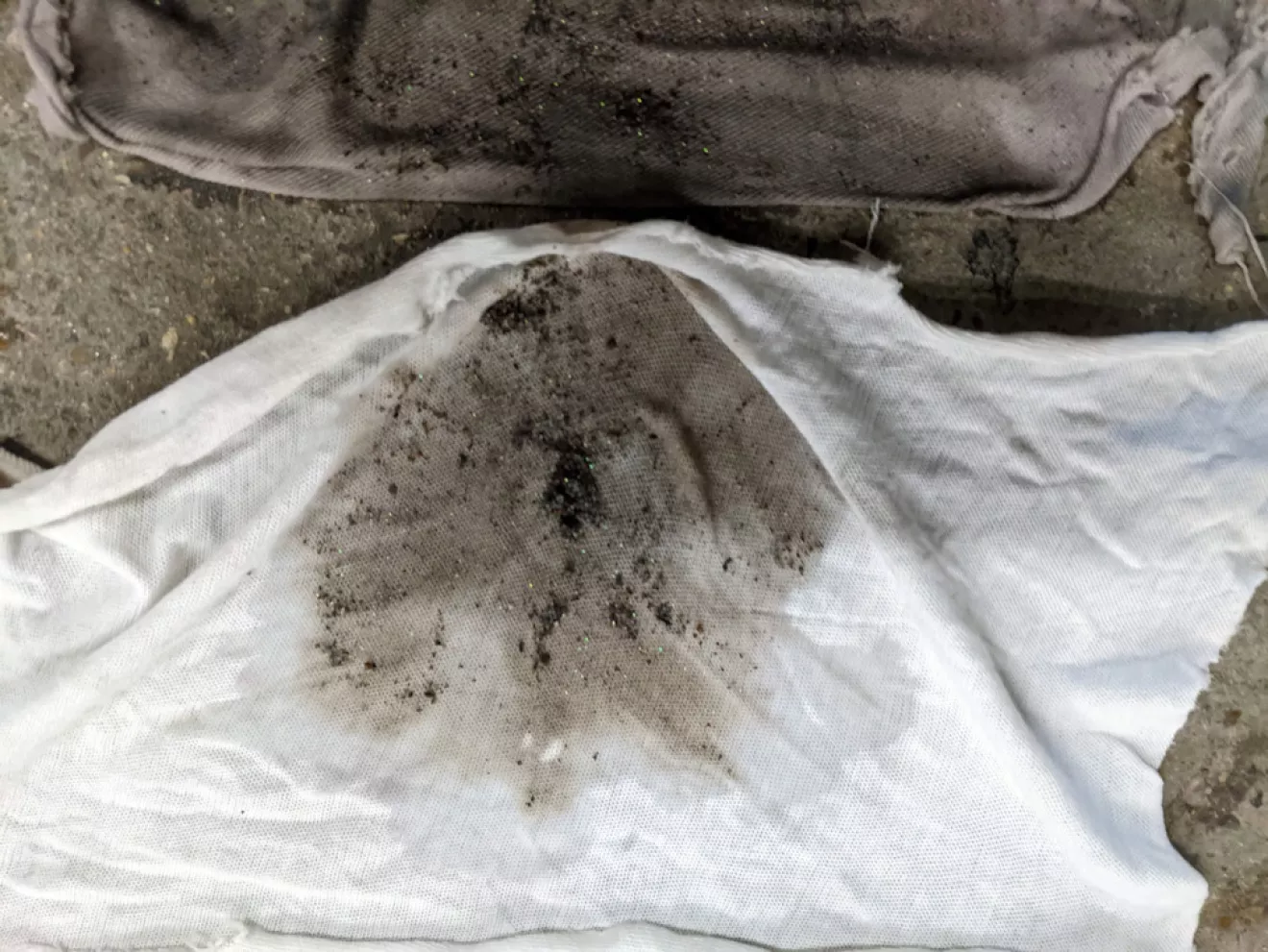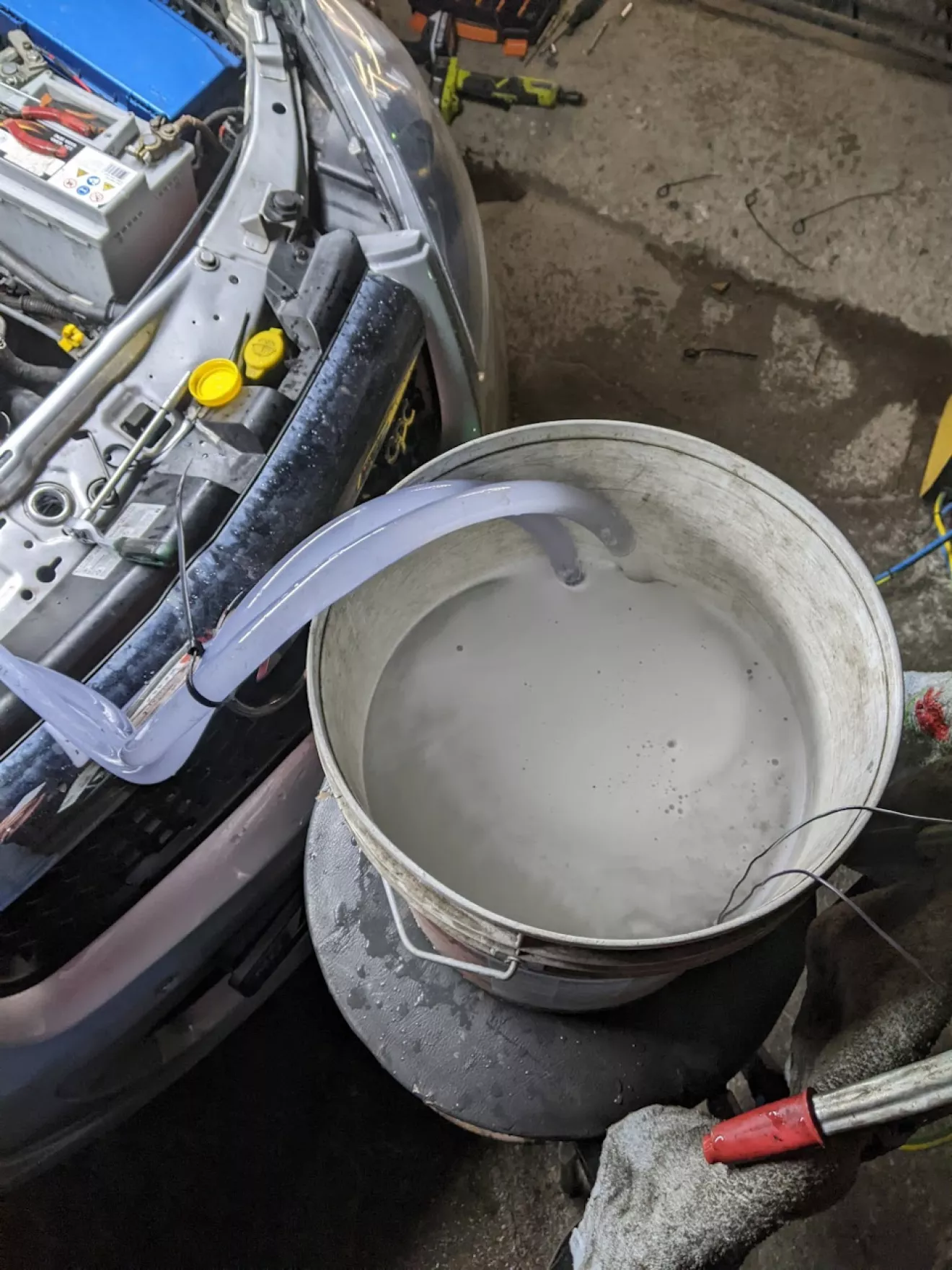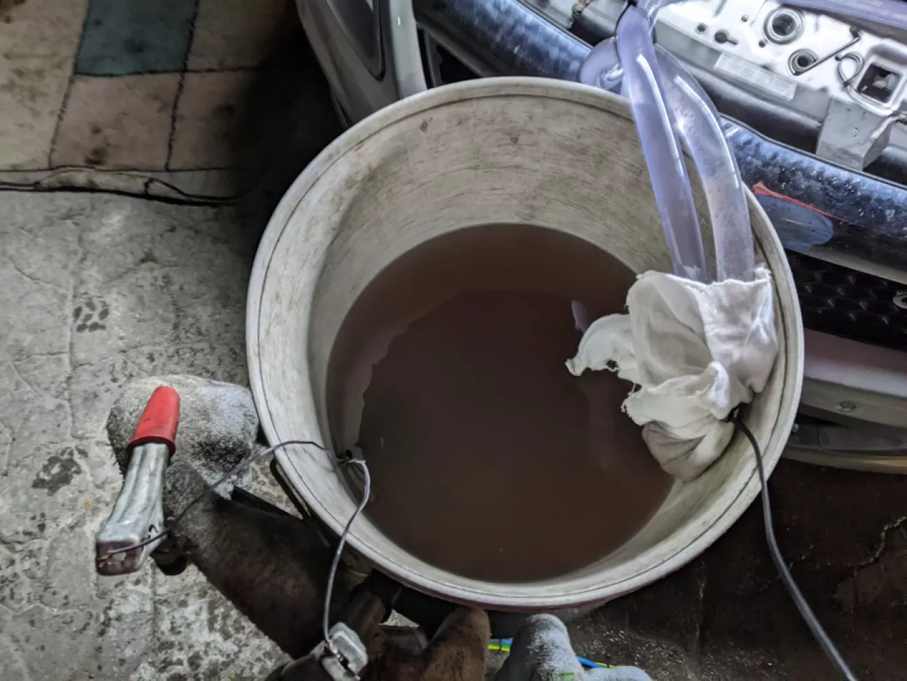 Вот такая жижа вышла при первом прогоне. Сначала насос остановился через пару секунд — подумал, что сгорел. Потом поменял шланги местами, и началось выстреливание вместе со шлаком — оказалось, что изначально была пробка, и насос не смог продавить.