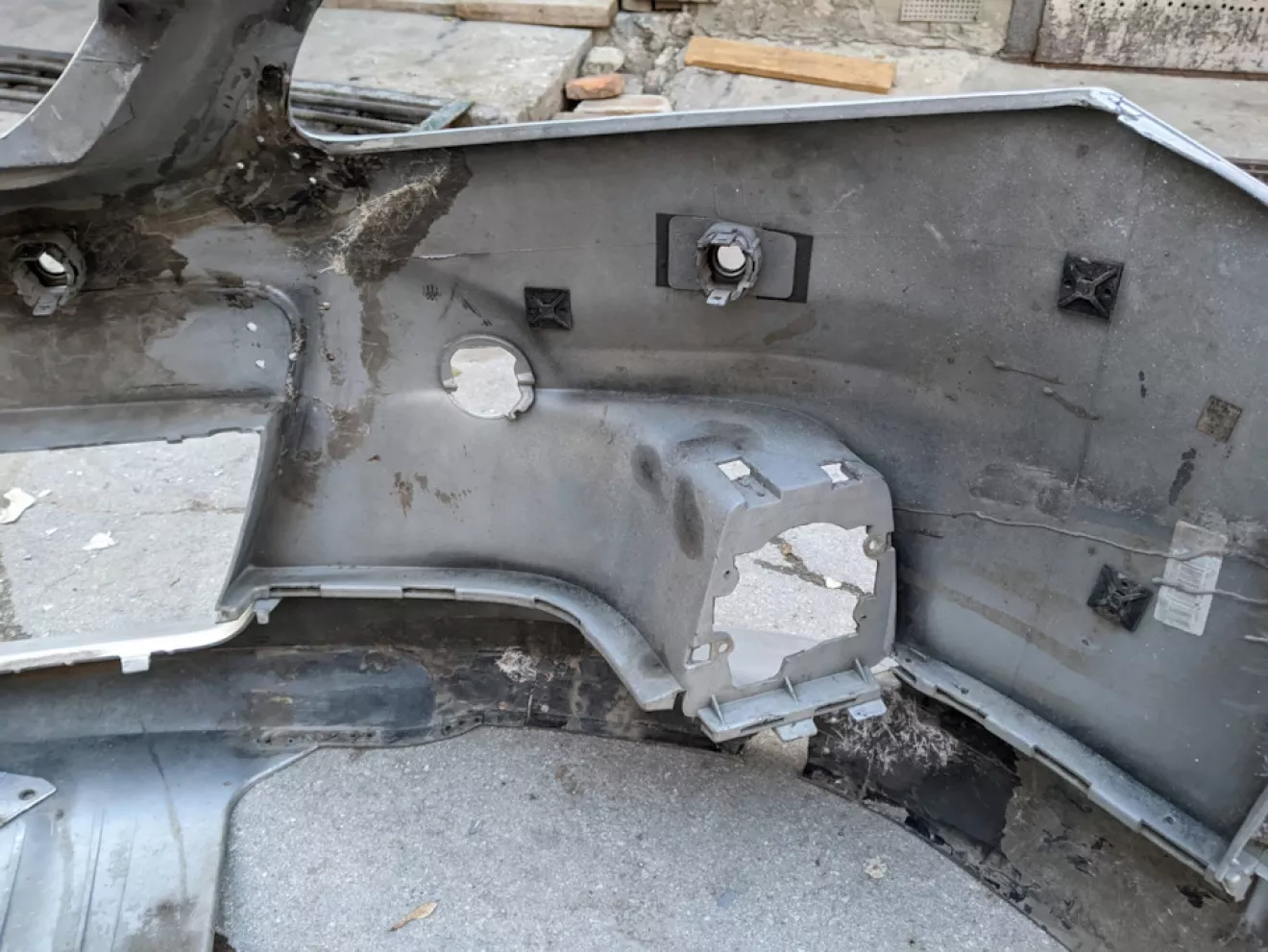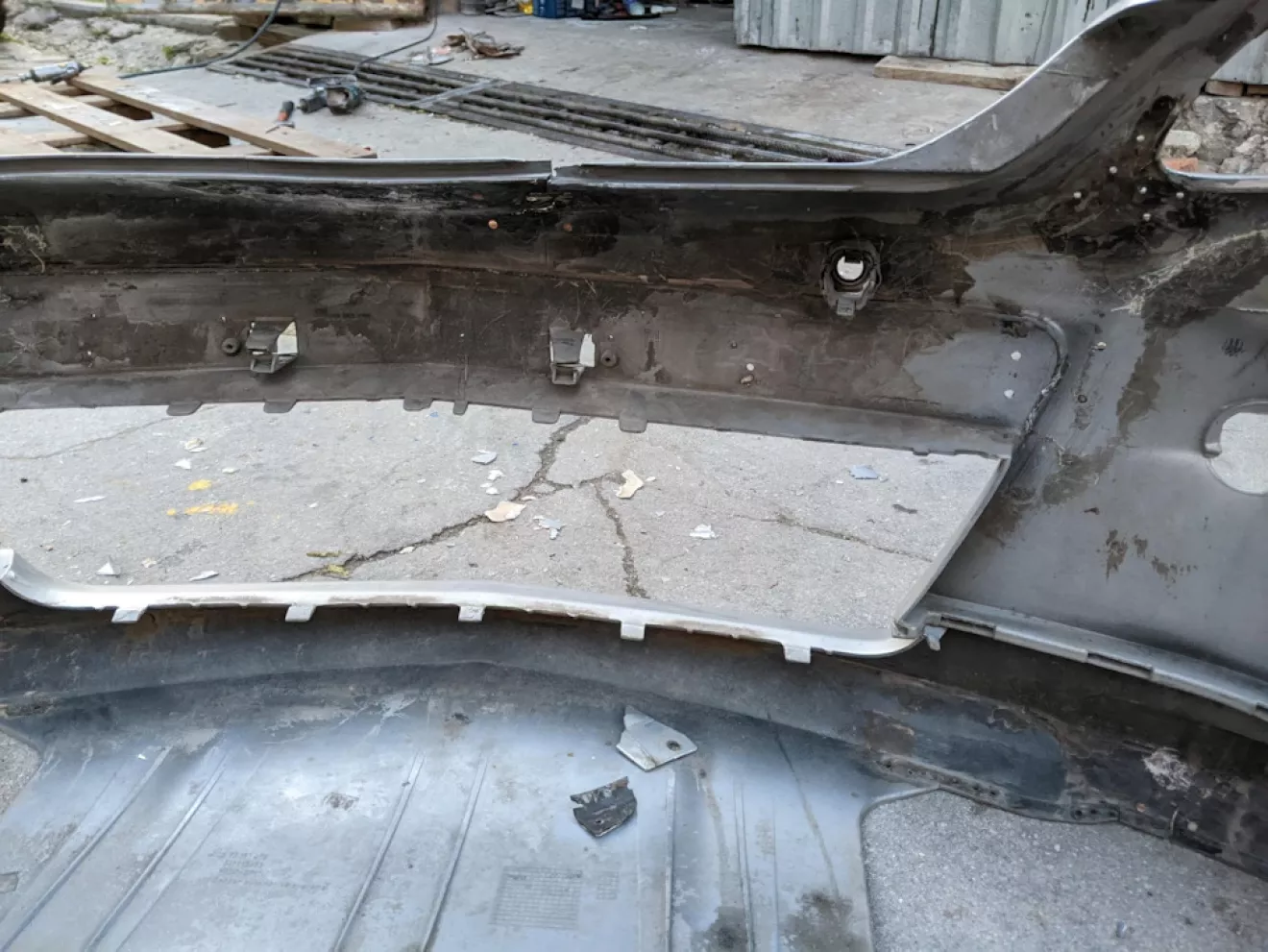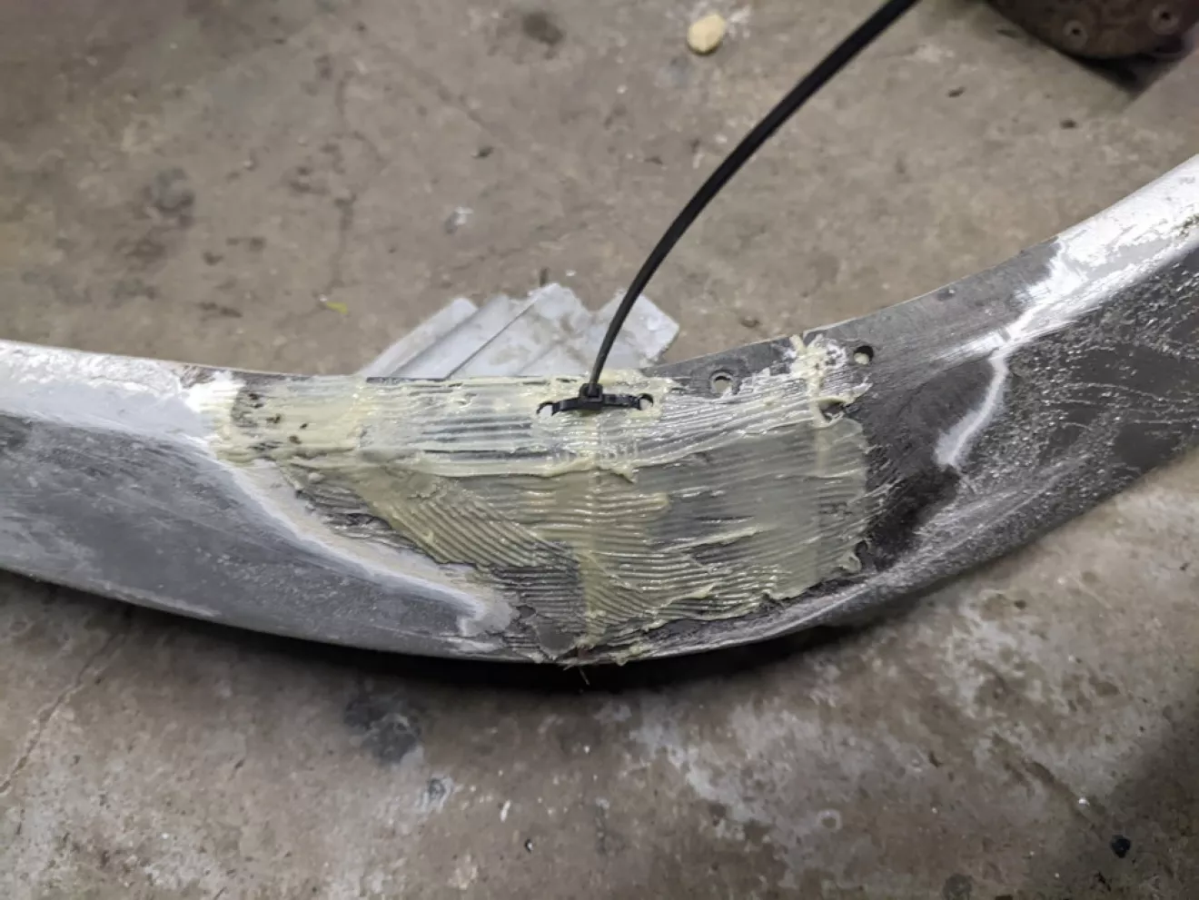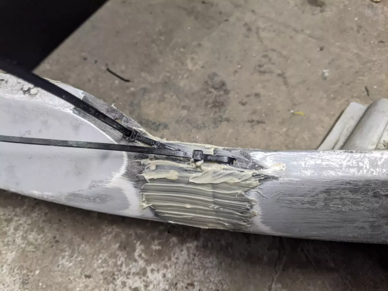Шлифовка, чистка, клейка, и всё это заняло примерно недели 3, в начале было тяжелее всё крепить чтоб придать форму, крепил всякими способами которые приходили в голову, по итогу всё заклеил и придал нужную форму, при этом сняв с бампера пару КГ, да бампер был довольно тяжелый по началу. Делал так, там где трещина, в конце высверливал отверстия чтоб дальше не пошло и по сторонам для крепления стяжек, таким способом получилось закрепить все поврежденные места, в конце заделываем отверстия тем же клеем.