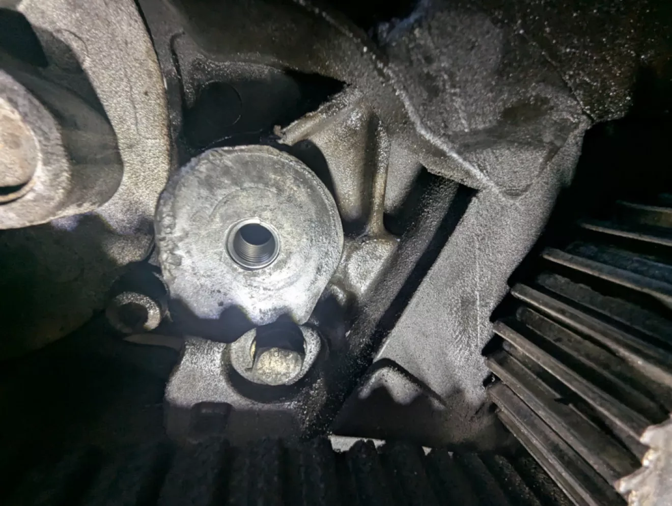 Ничего не предвещало проблем, но, как оказалось, мелочь может всё испортить. Ремень не всегда удаётся надеть по меткам с первого раза. В первый раз натянул, закрутил натяжной ролик — метки не совпали. Снял, а на болте натяжителя обнаружилась сорванная алюминиевая резьба.