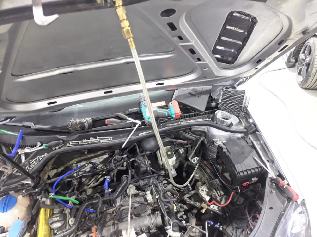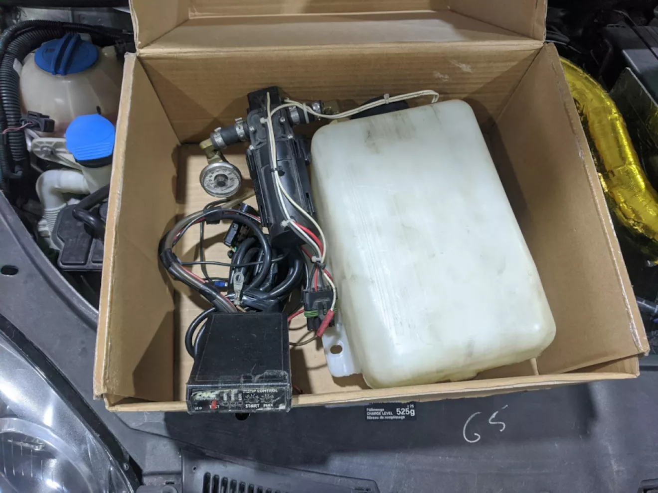 Ещё попался кит водометанола за хорошие деньги, почему бы и не взять, установили его за диваном в багажнике, протянули шланг и провода через порог и нашли отверстие правее от вакумника, его и использовали. ФОрсунку установили прямо перед заслонкой впускного коллектора.