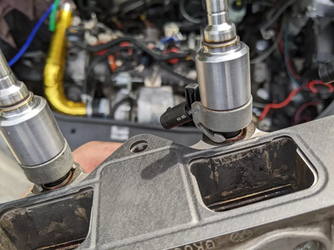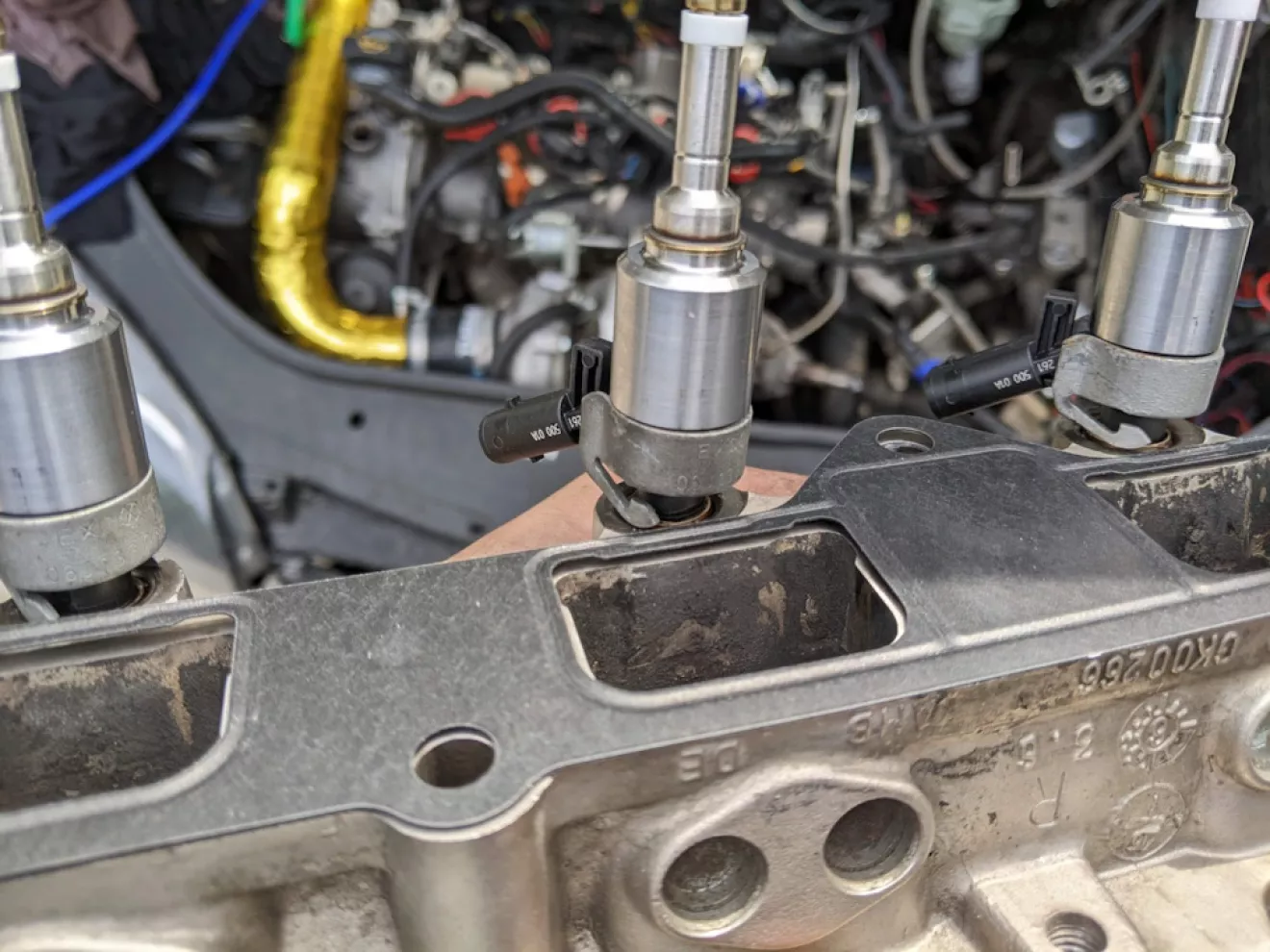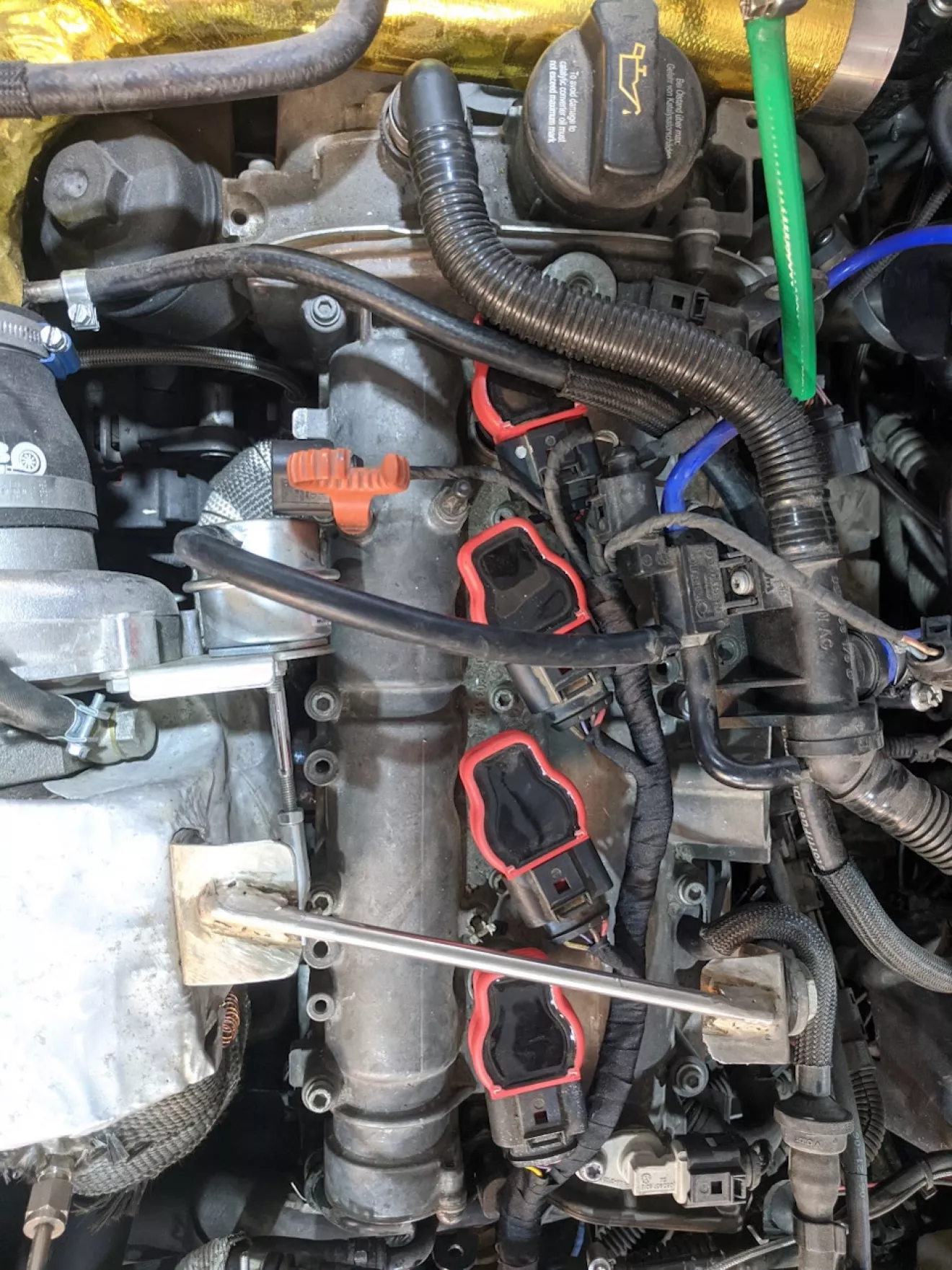 После того как сьели шоколадку, раздумав чё делать дальше — решили ставить форсунки от CCZA он же 2.0TSI. К сожелению не сфоткал но для этого надо изготовить фтулки толщиной в 1мм и запресовать их в рампу на красный резьбовой герметик. Вот так получилось