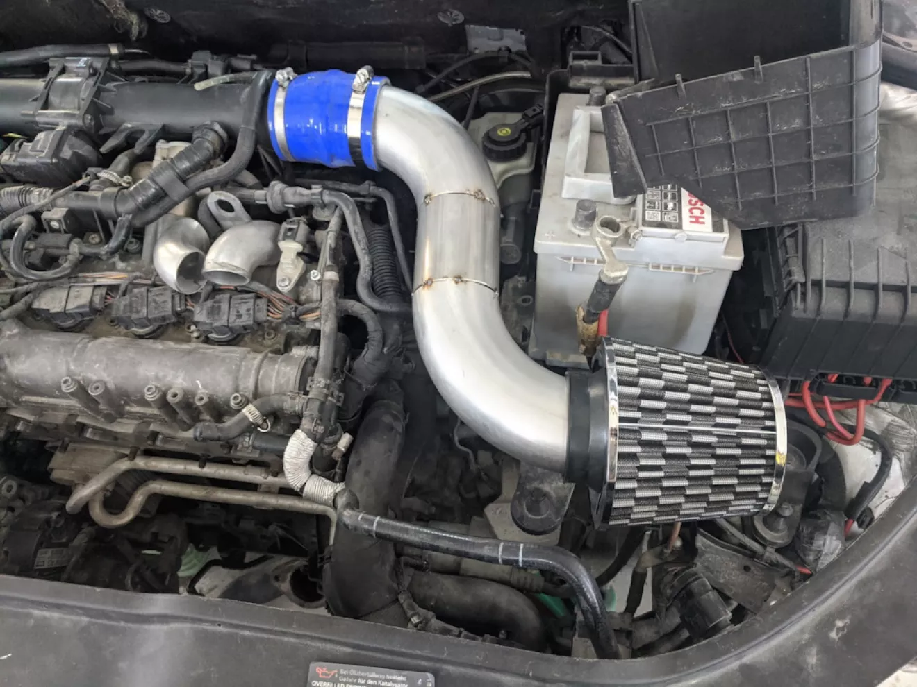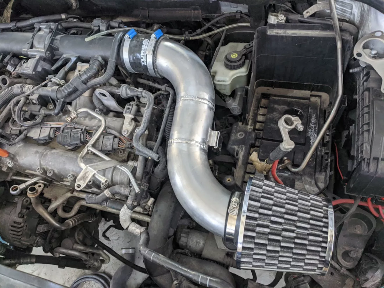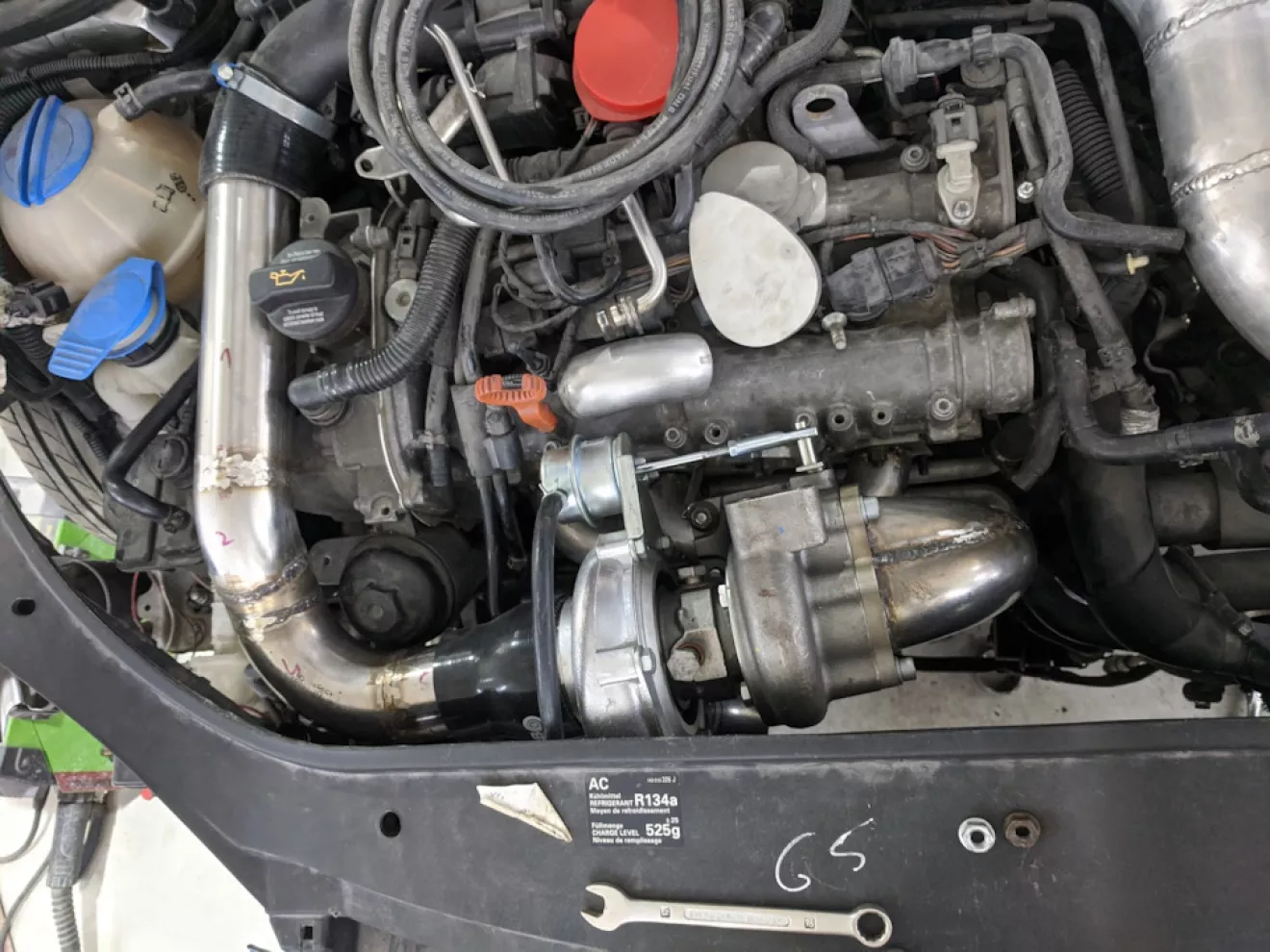 Ещё летом 2020 года была куплена китай турбина аналог GT2860R, сток турба сильно помирала — уже кое как додувала, было принято заменить на что-то повеселее. Интеркулер был взят 550мм x140мм x 65мм, как раз в место под усилитель, помещается идеально.