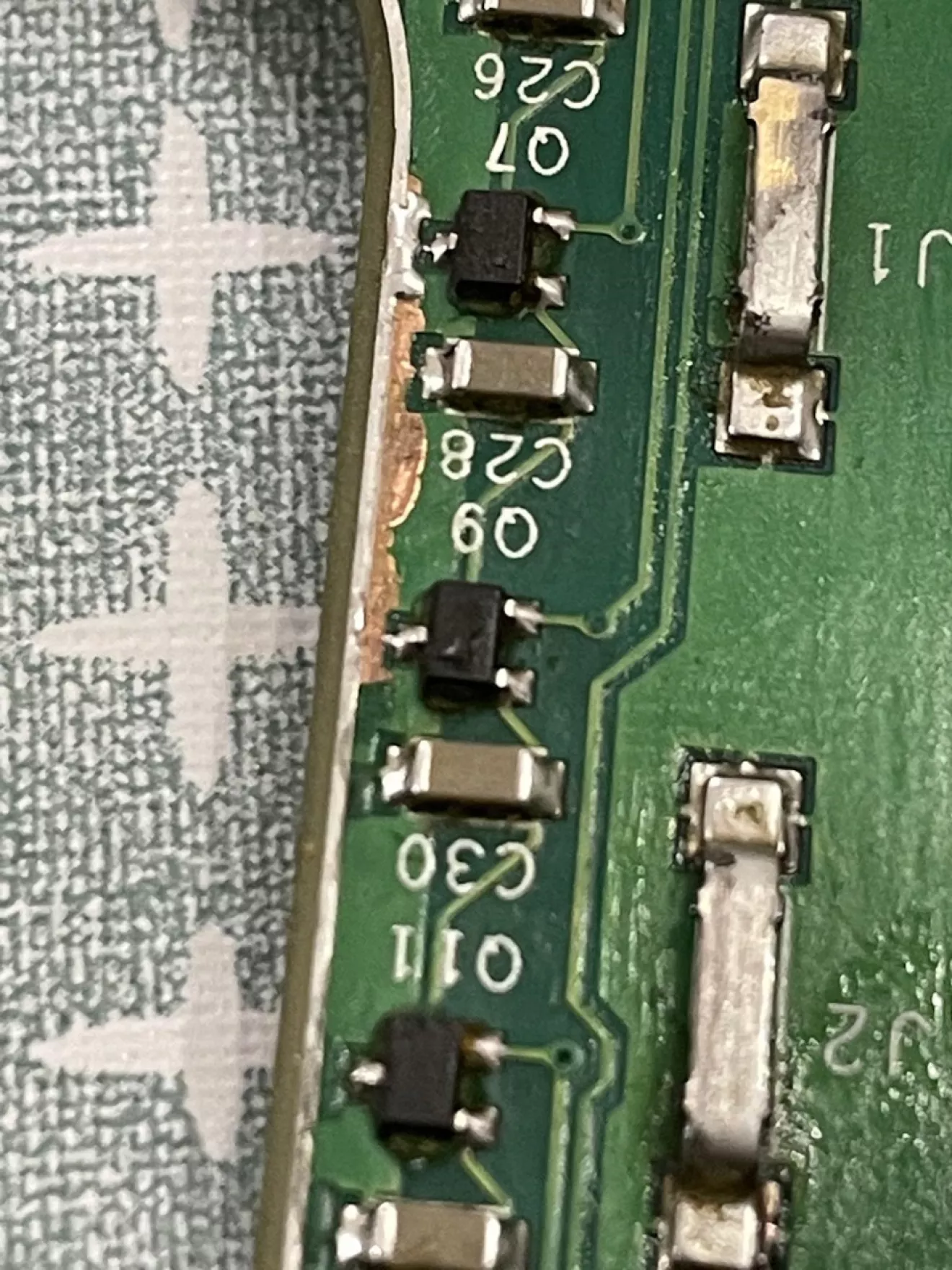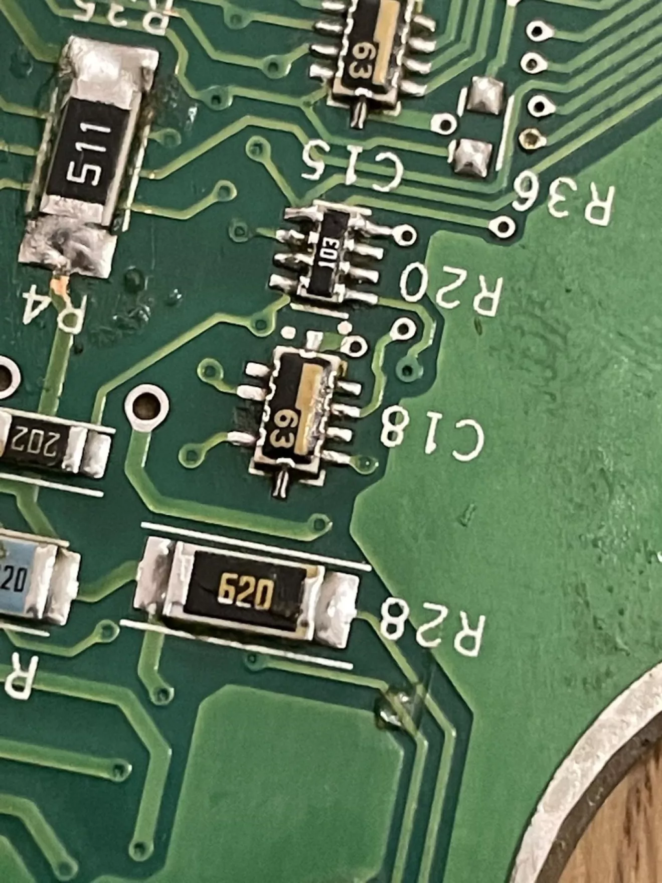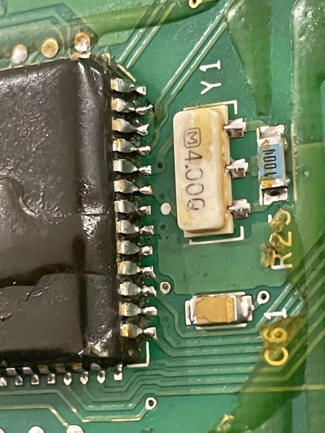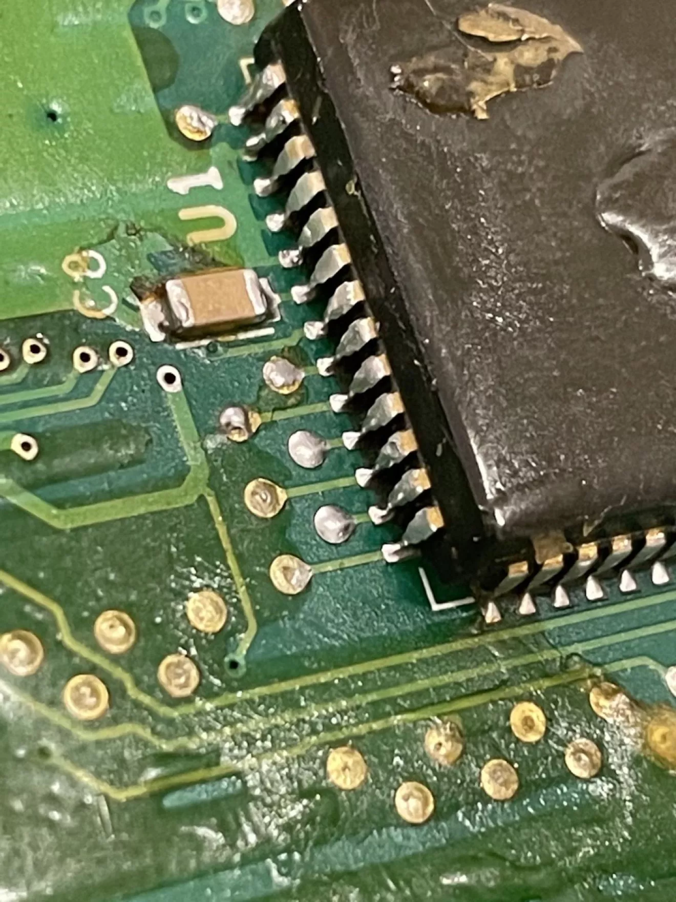 В паре мест запаяны трещины в дорожках, перепаяна куча ног, включая ноги контроллера, заменены некоторые резисторы и конденсаторы… В общем, что-то с ней делали определённо.