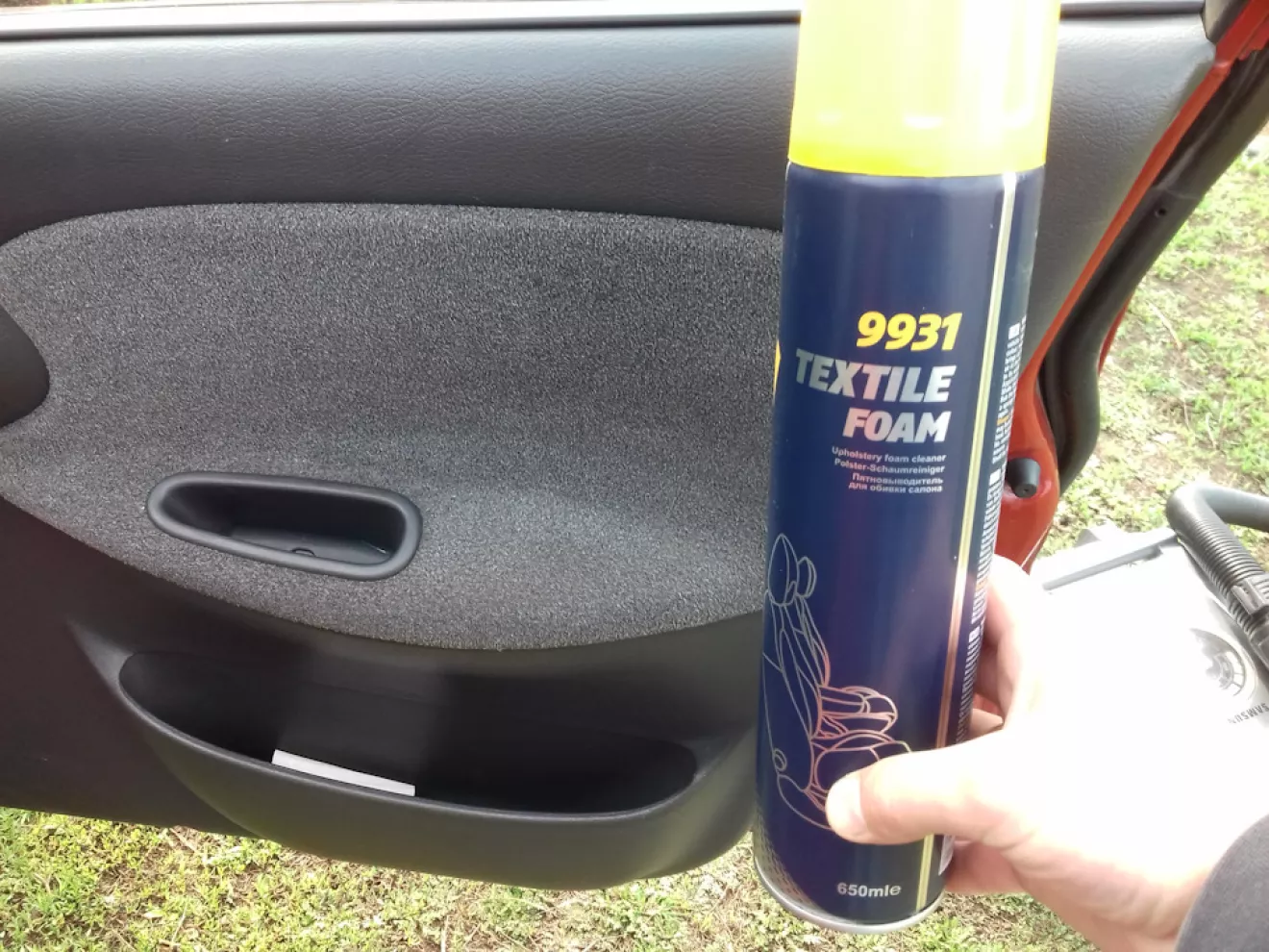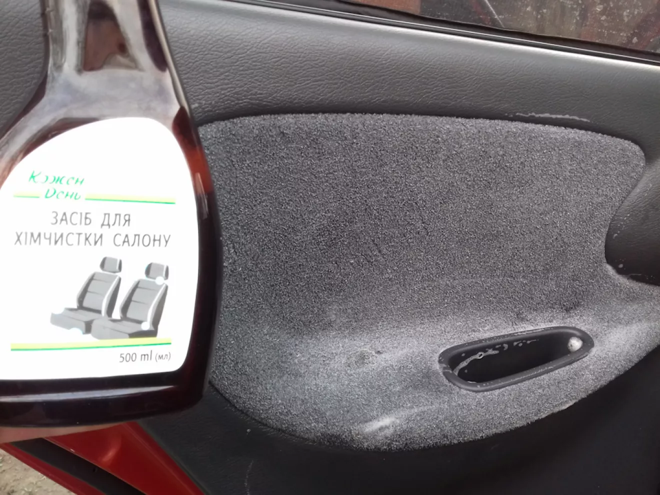 Для потолка и обивки на дверях использовал пшикалку "средство для хим чистки салона.". Промежуточная работа на фото. Фото потолка не делал так как все равно ничего не понятно, так как потолок не засраный, делал больше для профилактики. Было пятнышек — ушли.