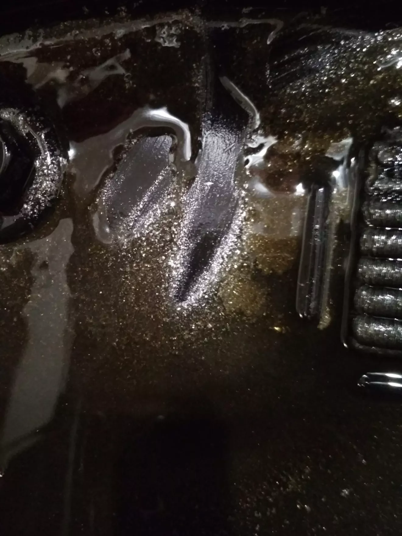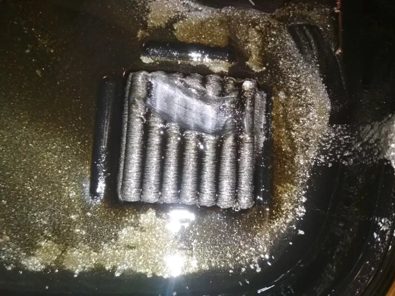 Поездив еще неделю (около 1000 км), скинули с другом поддон. Честно говоря я прозрел — в масле и на магните куча металической стружки. Закрыли коробку и поехал я думать что с ней делать.