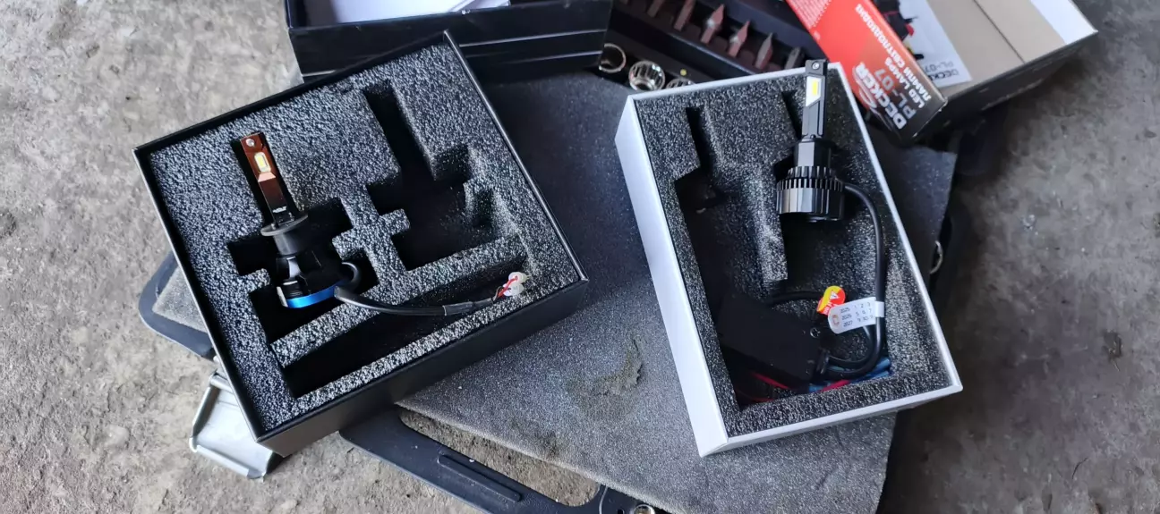 Нові лампи навіть важчі за старі. Раніше блочка не було ці вже з блоками. Блоки ледве запхав в корпус фари, ледве-ледве залізли в фару.