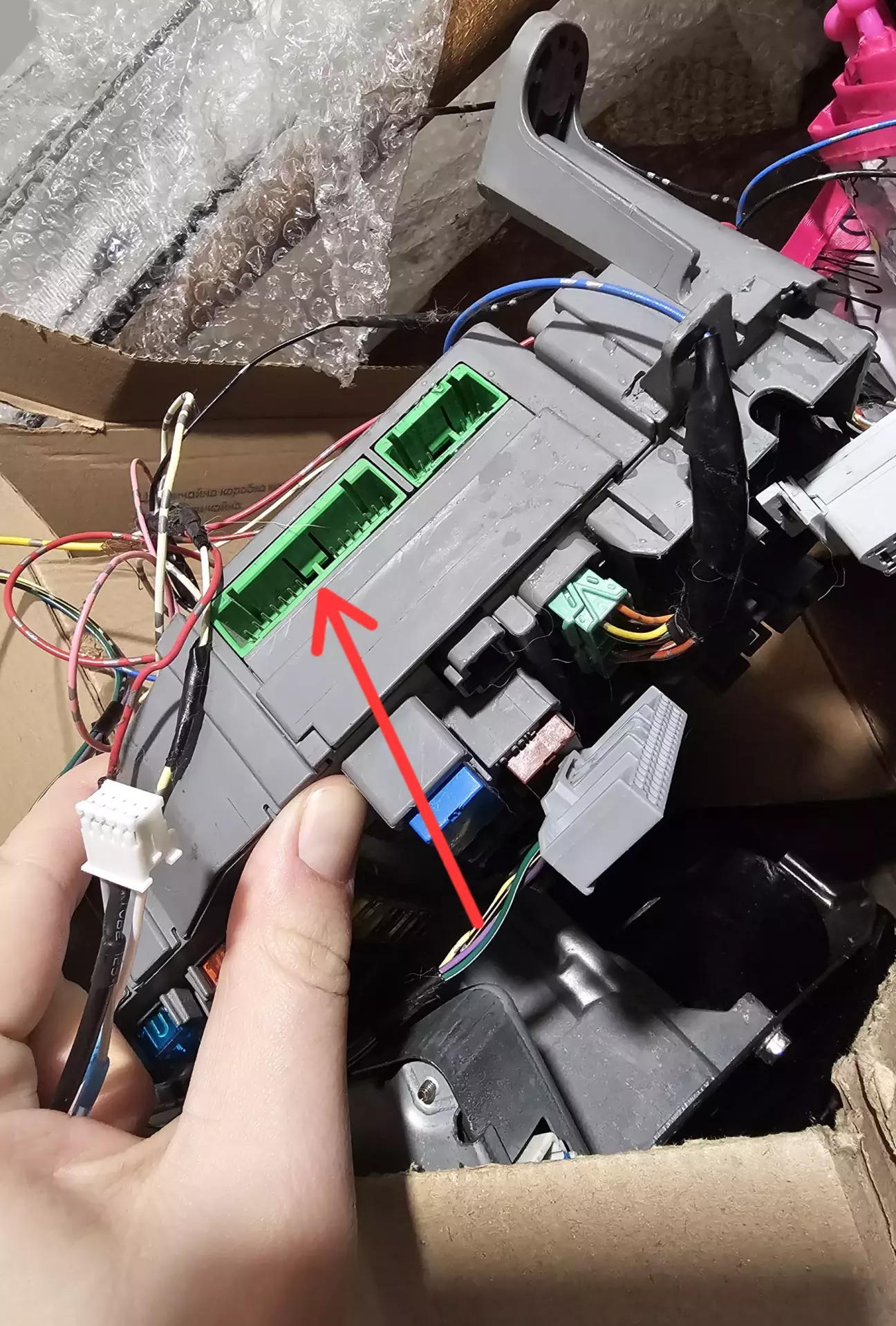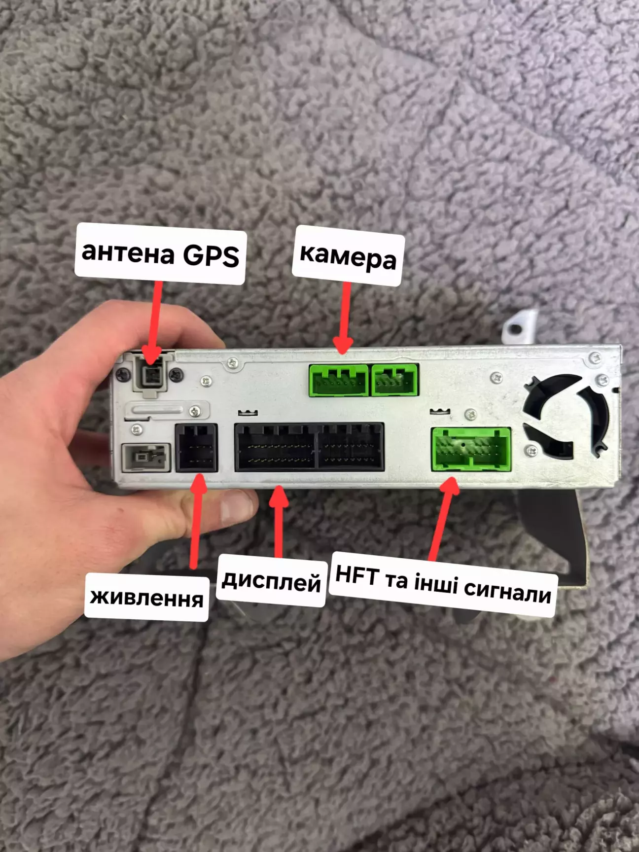По суті сюди підключаються усі рідні фішки що були в автомобілі. Із нових фішок це 10 пінова фішка саб дісплею та 20 пінова екрану, яка буде йти у новій проводці.