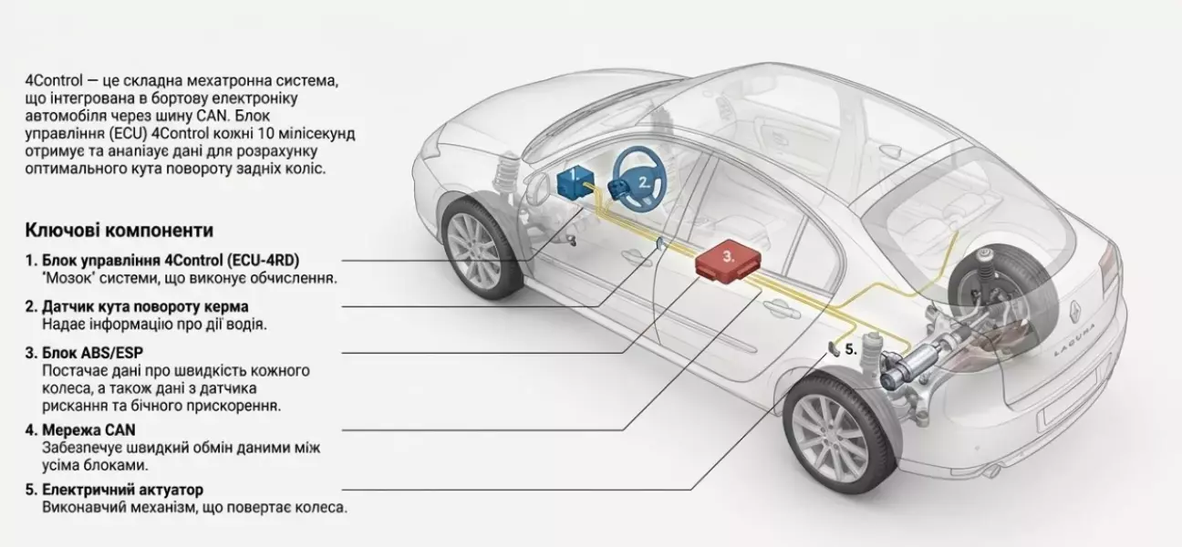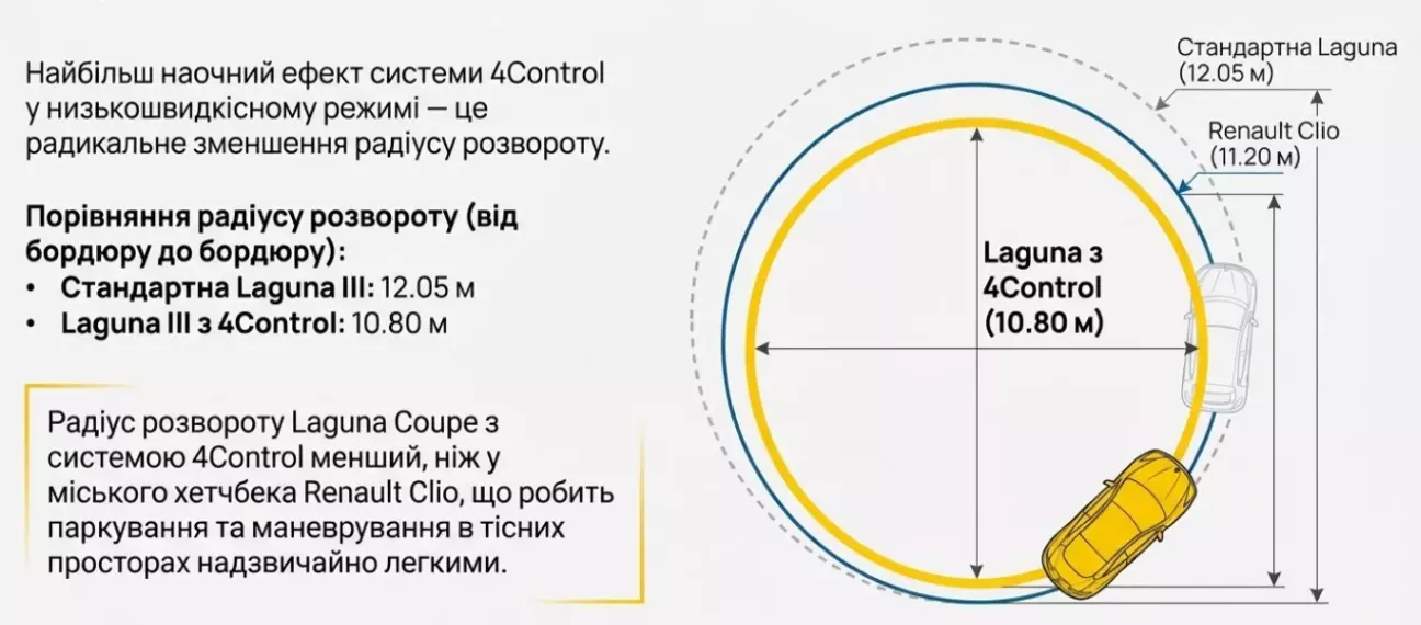 Фізика 4Control — це постійне керування центром повороту автомобіля. Замість того, щоб бути пасивним об'єктом, що опирається законам інерції, Laguna Coupe активно підлаштовує свою геометрію під вектори сил, що діють на неї в кожну секунду руху.