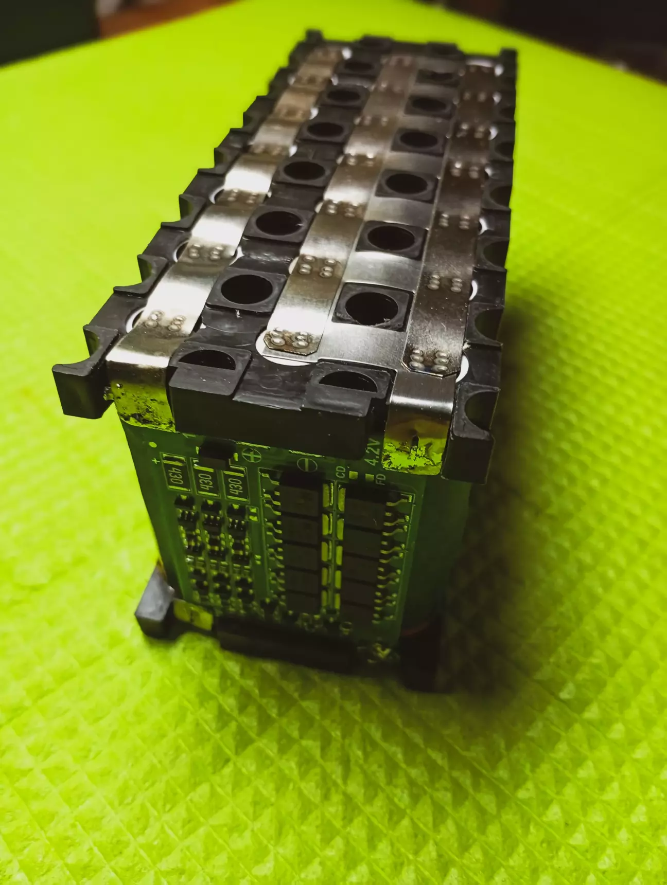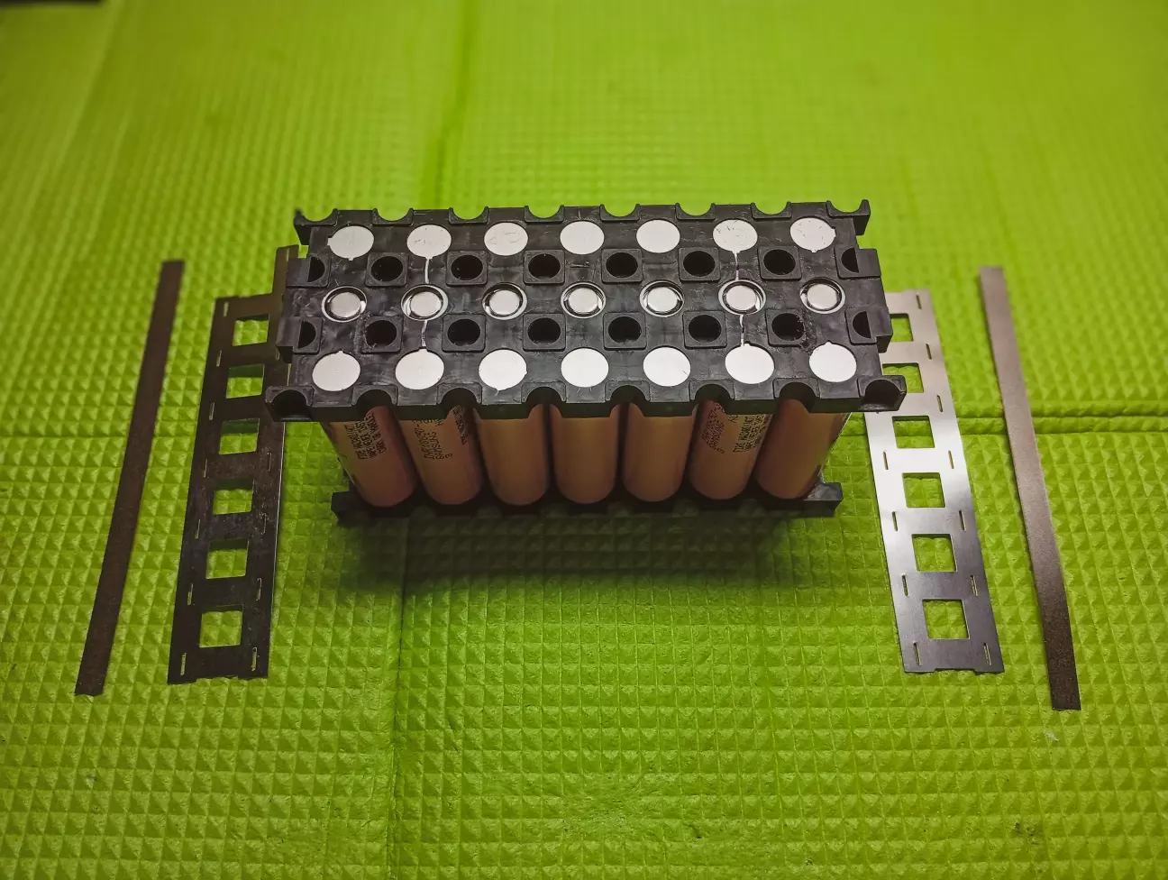 Для більш меньшого опору, щоб не грілися стрічки і не втрачати на струмі, проварив всі стрічки подвійні, крім перемичок, там і тих достатньо. Стрічкою варив 0.15мм