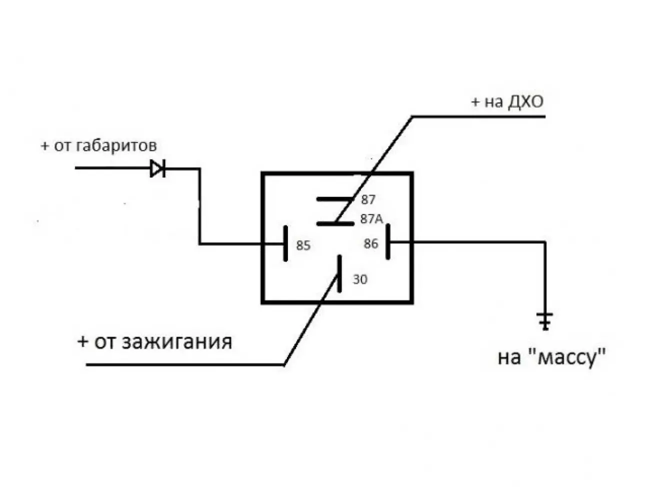 Після зборки , підключення та діагностики виявилось що контролер ДХО під час вмикання габаритів/ближнього свіла , зменшує напругу яку подає на ДХО тим саммим зменшує яскравість, а не вимикає їх, а враховуючи що після контролера ДХО біло встановлено стабілізатор напруги то під час вмикання габаритів/ближнього свіла, ДХО продовжували працювати без змін. Так як ідея була такова що під час вмикання габаритів/ближнього свіла ДХО повинні були вимикатися то було прийняте рішення доопрацбвати схему за рахунок п'тиконтакного реле . Схема підключення доволі проста: