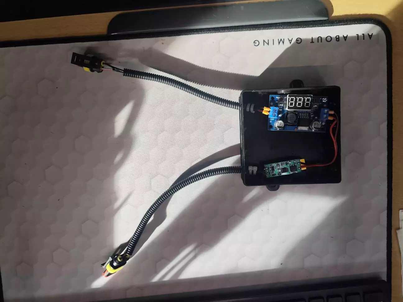 Для керування ДХО замовив контролер ДХО на аліку та для подачі стабільних 12В на них стабілізатор напркги , обидва пристрої через термо прокладку посадив на алюмінієві радіатори та запакував все це у чорну монтажну коробку , всі отвори та кришку обробив герметиком для досягненя герментичності.
