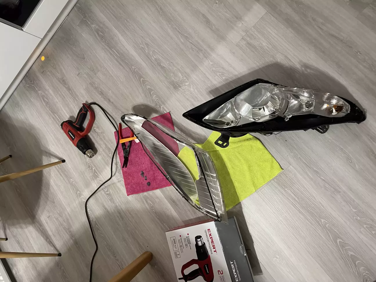 - Зняв фари і вже вдома розпакував, прцював у рукавичках, кожна фара зайняла ~15 хв. Спочатку зняв кліпси, розігрів по периметру а далі вже обережно розштовхував інструментом паралельно гріючи феном.