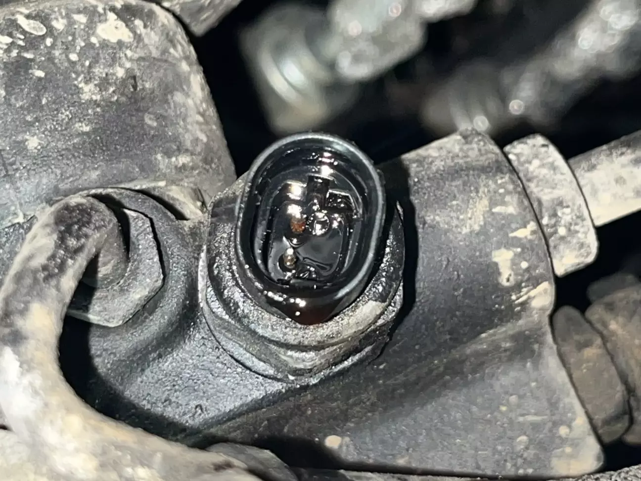 Позаяк часткова заміна рідини та нормалізація її рівня ні до чого не призвели, залишився сам «світч». Розташований він на рульовій рейці з лівого боку і спрямований назад. Коли я зняв розʼєм, зсередини датчика, як за підручником, потекла ATF.