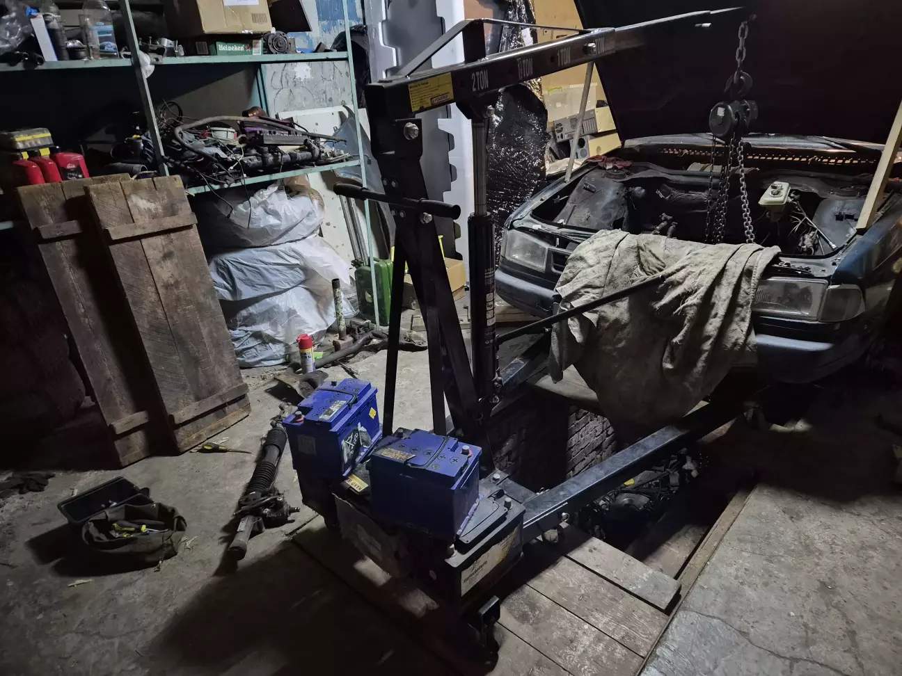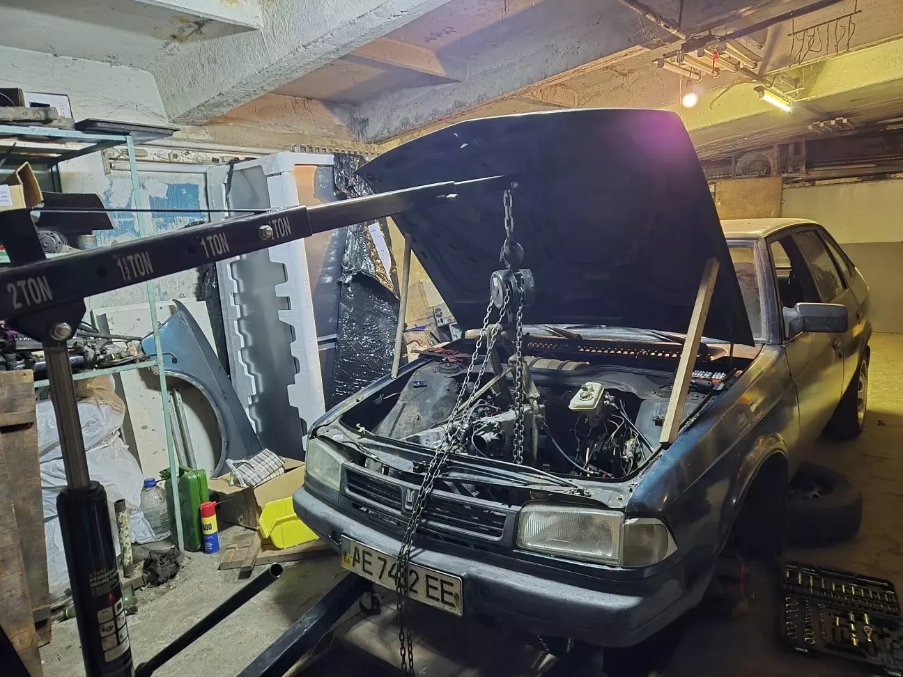 Сказано-зроблено, беремо кран, ланцюгову таль, і намагаємось зняти двигун разом з КПП вниз, в яму