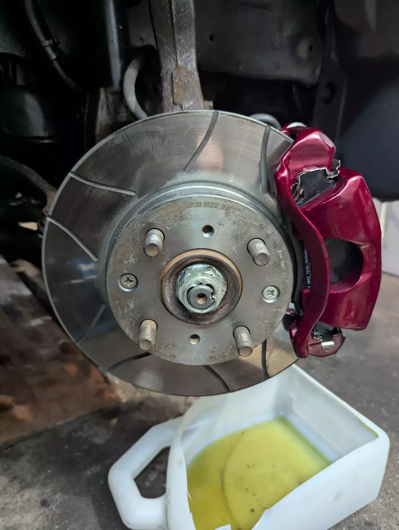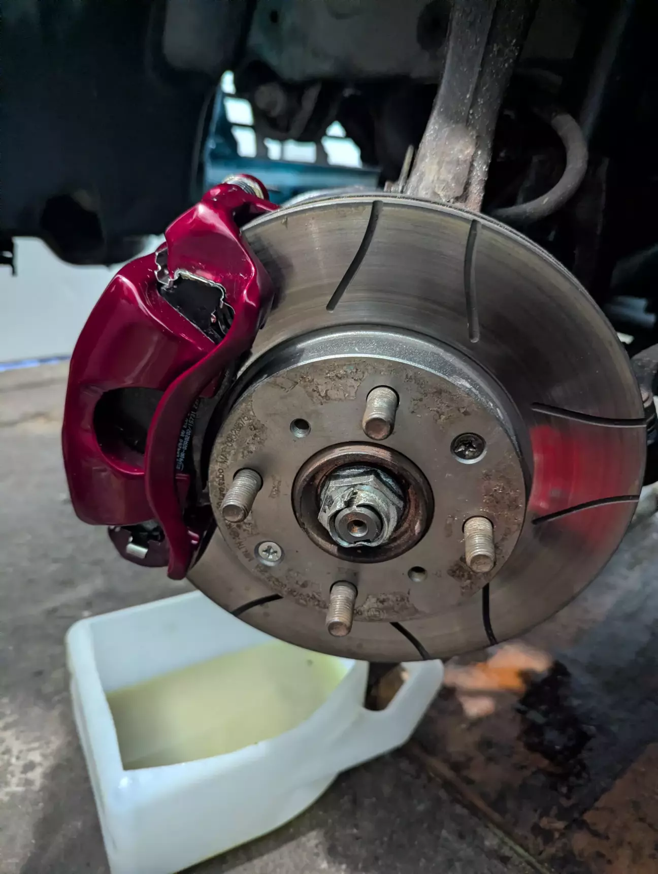 В цей раз все пройшло набагато простіше, на досвіді, так би мовити: після недовгої боротьби з болтами і трубками гальмівної рідини, старі супорта були зняті, нові накинуті, колодки змащені і поставлені, гладко і без зайвого шуму і пилу.