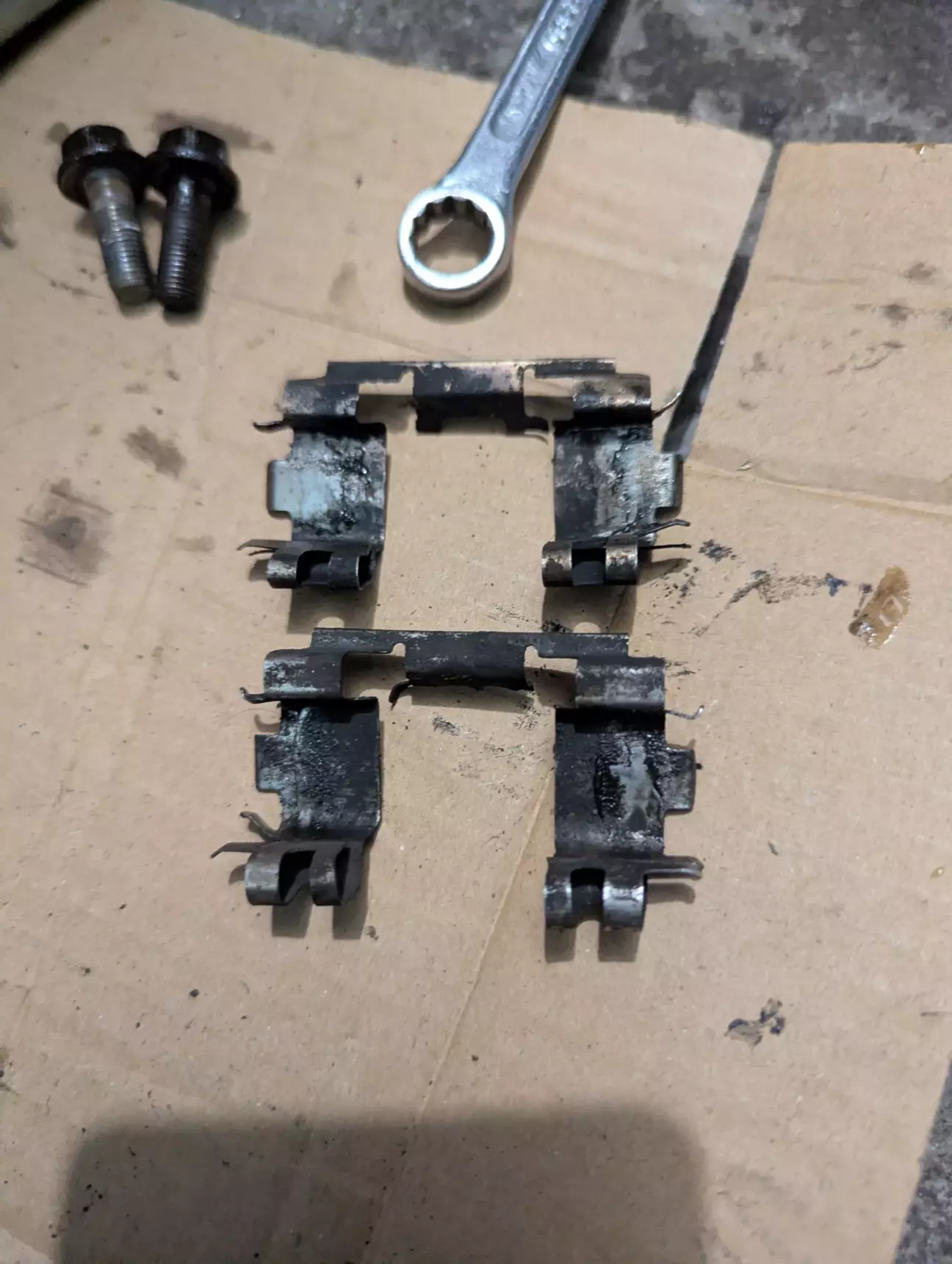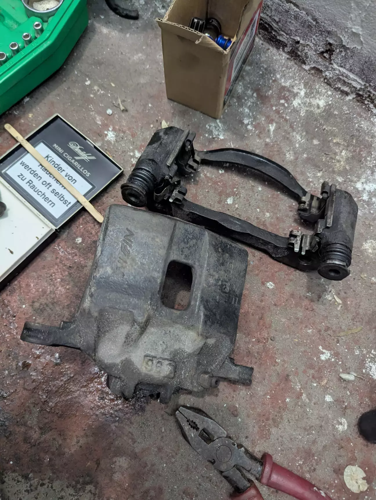 Отже, поміняв я гальмівні диски і колодки в попередньому дописі, але в процесі було помічено, що якось не дуже працюють супорта, а саме стан механізму трошки не ок був, а ще точніше - хід рамок супортів і, відповідно, колодок бентежив. На обслуговування супортів натякнув і @PrikolistUA в коментах, але з першого разу якось воно вже було не дуже по часу, тому полетів до кента на другу спробу через тиждень. Розібрали все назад, виявилось, що в принципі всім направляйкам погано, та і пильнички вже дубові загалом всі, та і пластини під колодки вже теж зношені, а з лівої сторони так і взагалі обидві верхні чогось, лол)))Шо вони там притискали і як давно так стояло - невідомо