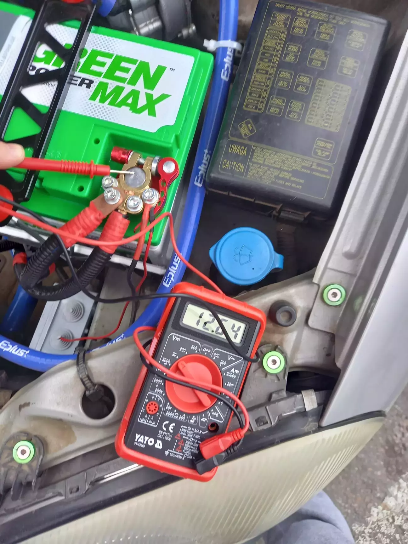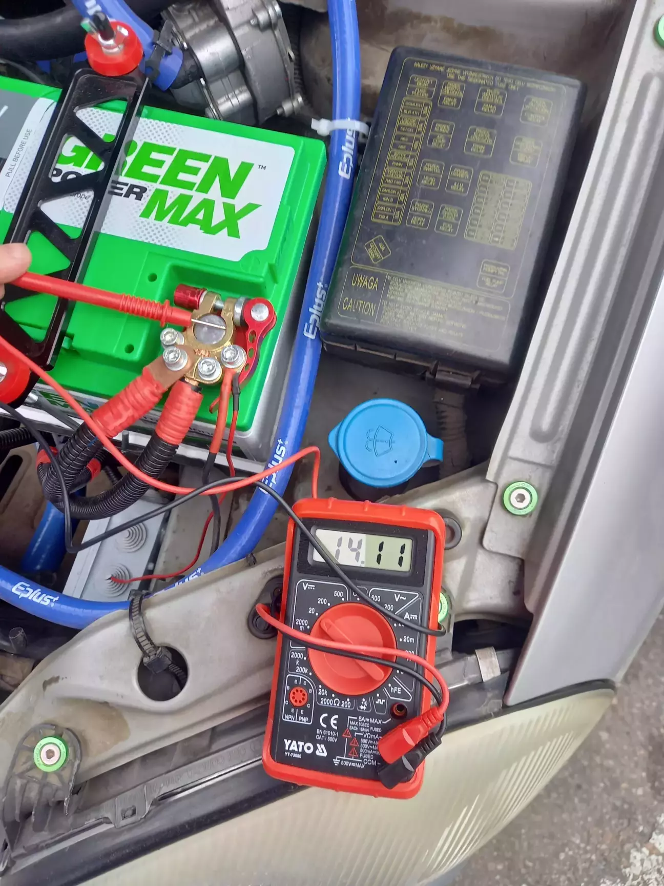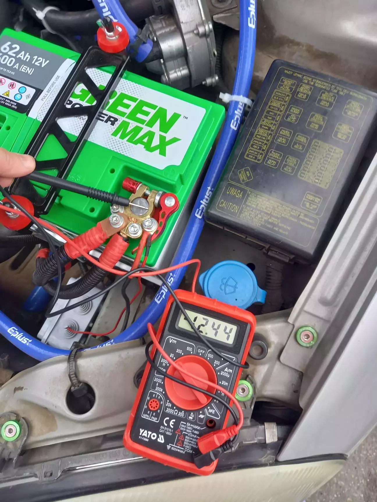 Напруга на клемах АКБ одразу після покупки: 12.64 В. Напруга при увімкненому запалюванні: 12.44 В (вольтметр у салоні занижчує показання приблизнона 0.3 В). З генератором: 14.11 В.