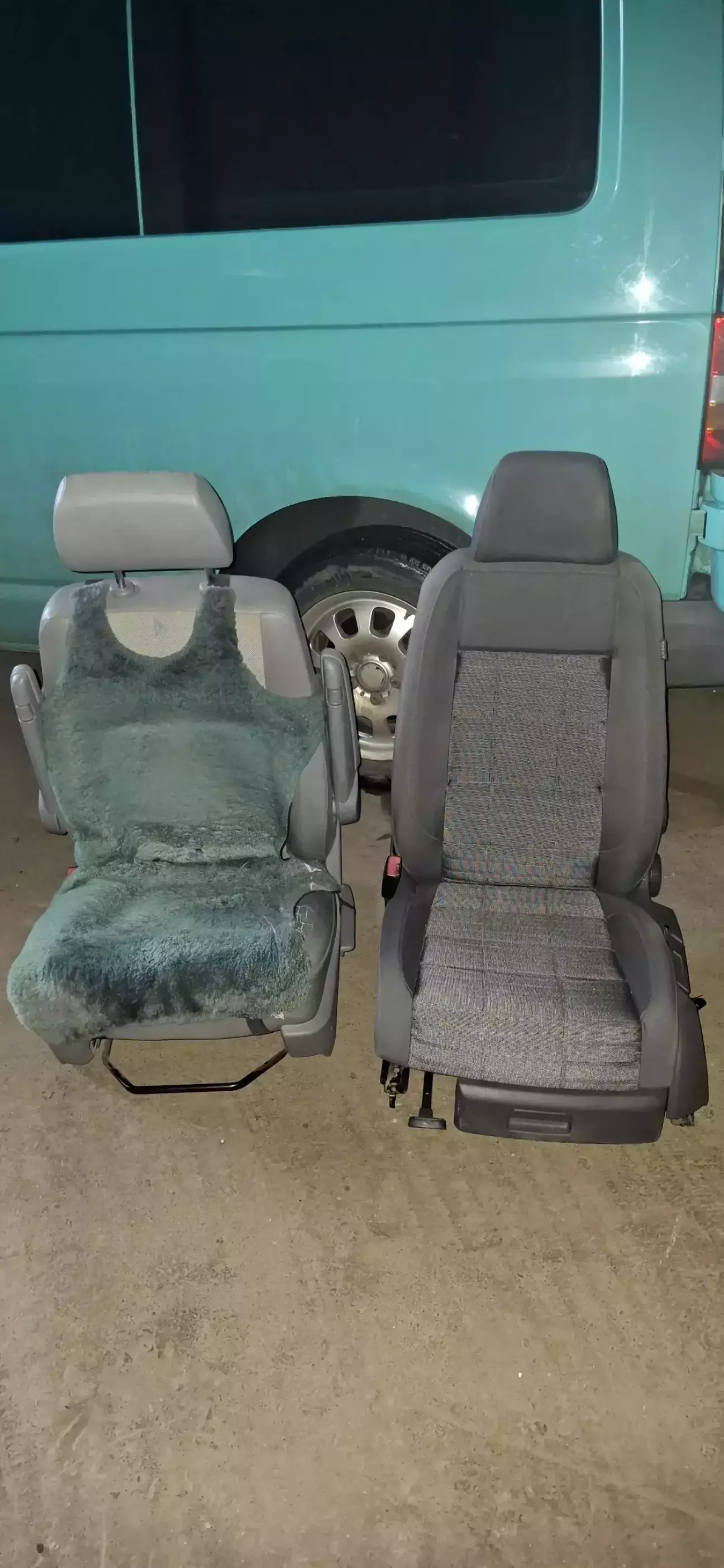 Сидіння начебто рідні були, вони на швидкоз'ємах до полу. Одне сідіння, як спарка подвійне, крайне відкідне та складне. Можливо я помиляюсь, але дуже схоже шо це саме для т5 (не для мого, мій с заводу груз був).