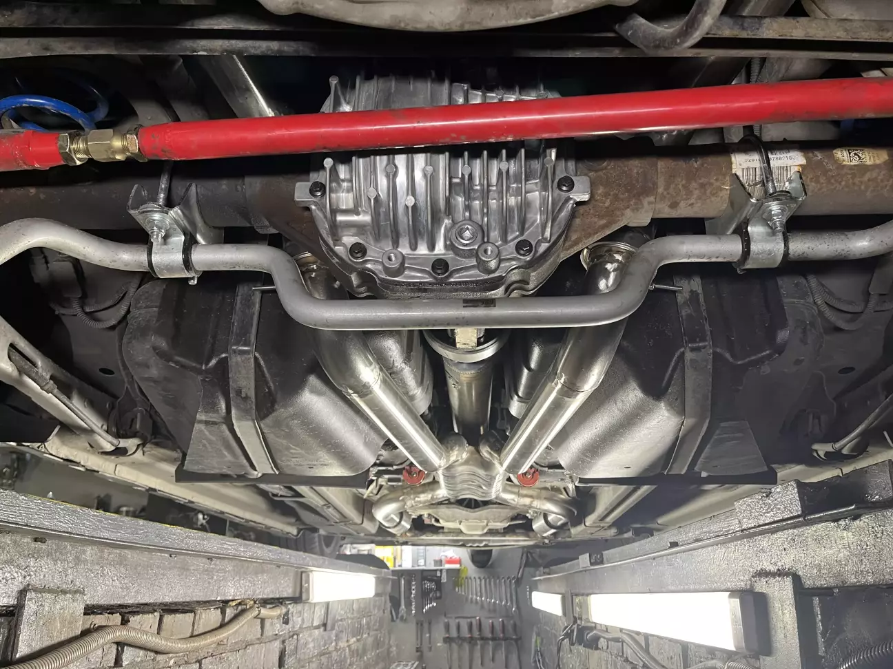 Перейдемо тепер до позитиву. Чергове оновлення підвіски. За цей період був встановлений кіт від Whiteline це регульовані стабілізатори передні та задні, та стійки стабілізаторів. І разом з цим поставлено комплект прогресивних пружин з заниженням 0,5 дюйма, а по факту весь 1 дюйм від ROUCH, ну і звісно регульована тяга панара від BMR. І також розпорка нижнього підрамника Steeda G-Trac brace. Керованість після цього змінилась радикально в кращу сторону. Автівку не впізнати. Кути розвали завалились, що є плюсом до керованості, але недостатньо, що я буду вирішувати у майбутньому.