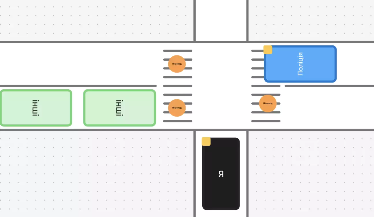 В якийсь момент зʼявляються пішоходи, всі приторможуюсть і в мене є шанс повернути, я спокійно із поворотником ліворуч під машину поліції, що повертає праворуч їду собі ліворуч.