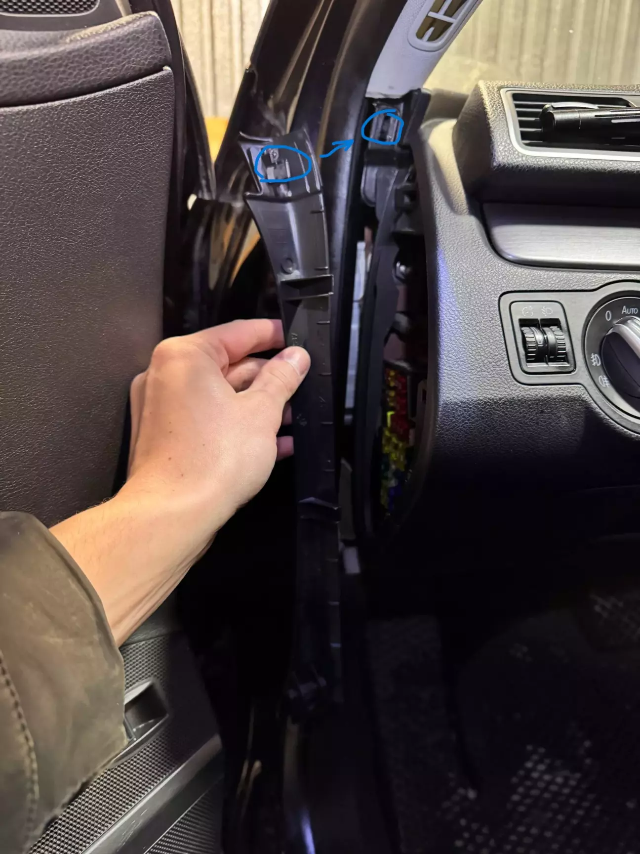 Далі знімаємо обшивку стійки. Знизу підковирюємо значок Airbag, під ним знаходиться Т20, відкручуємо його. Тягнемо на себе починаючи зверху.