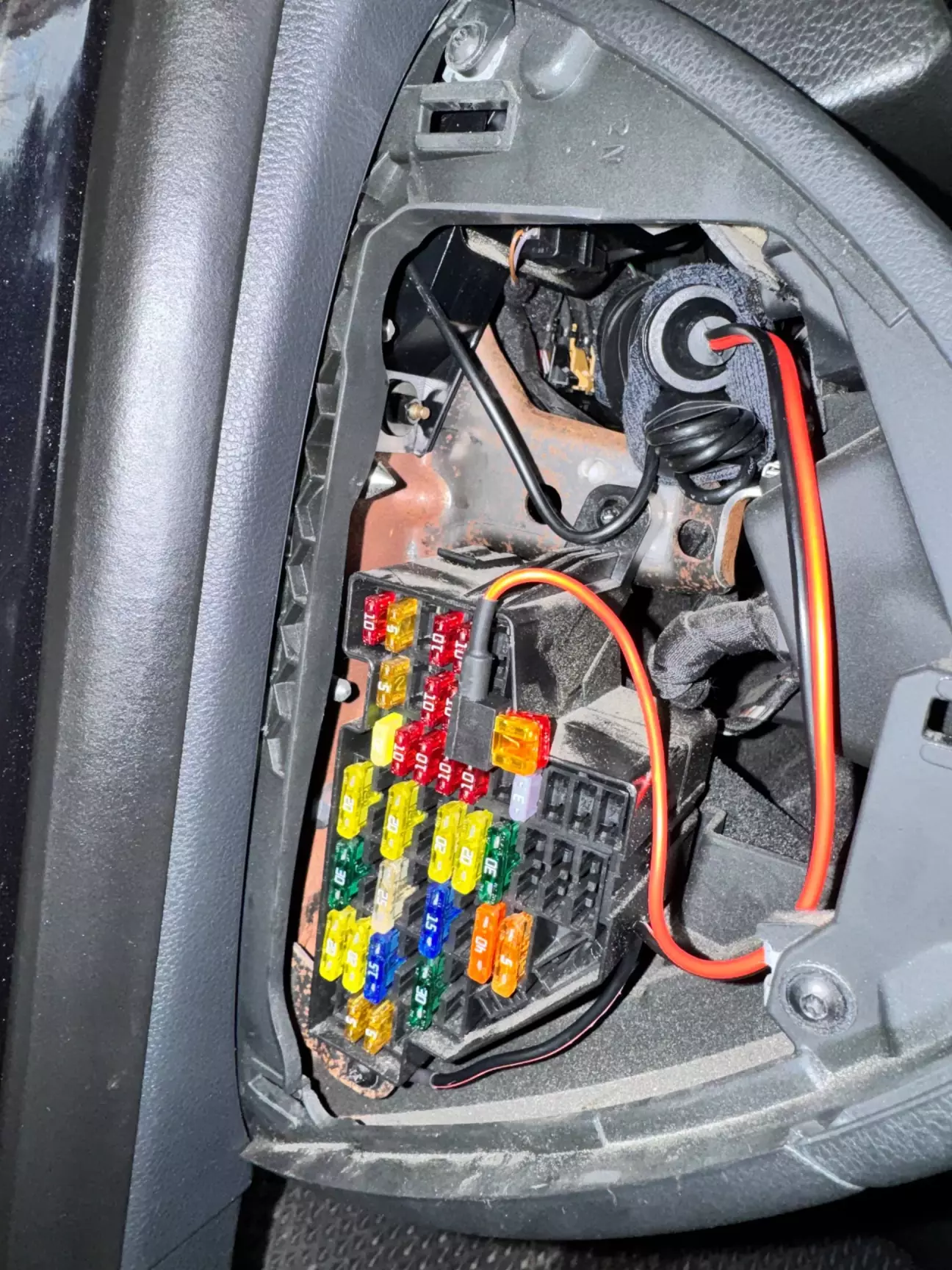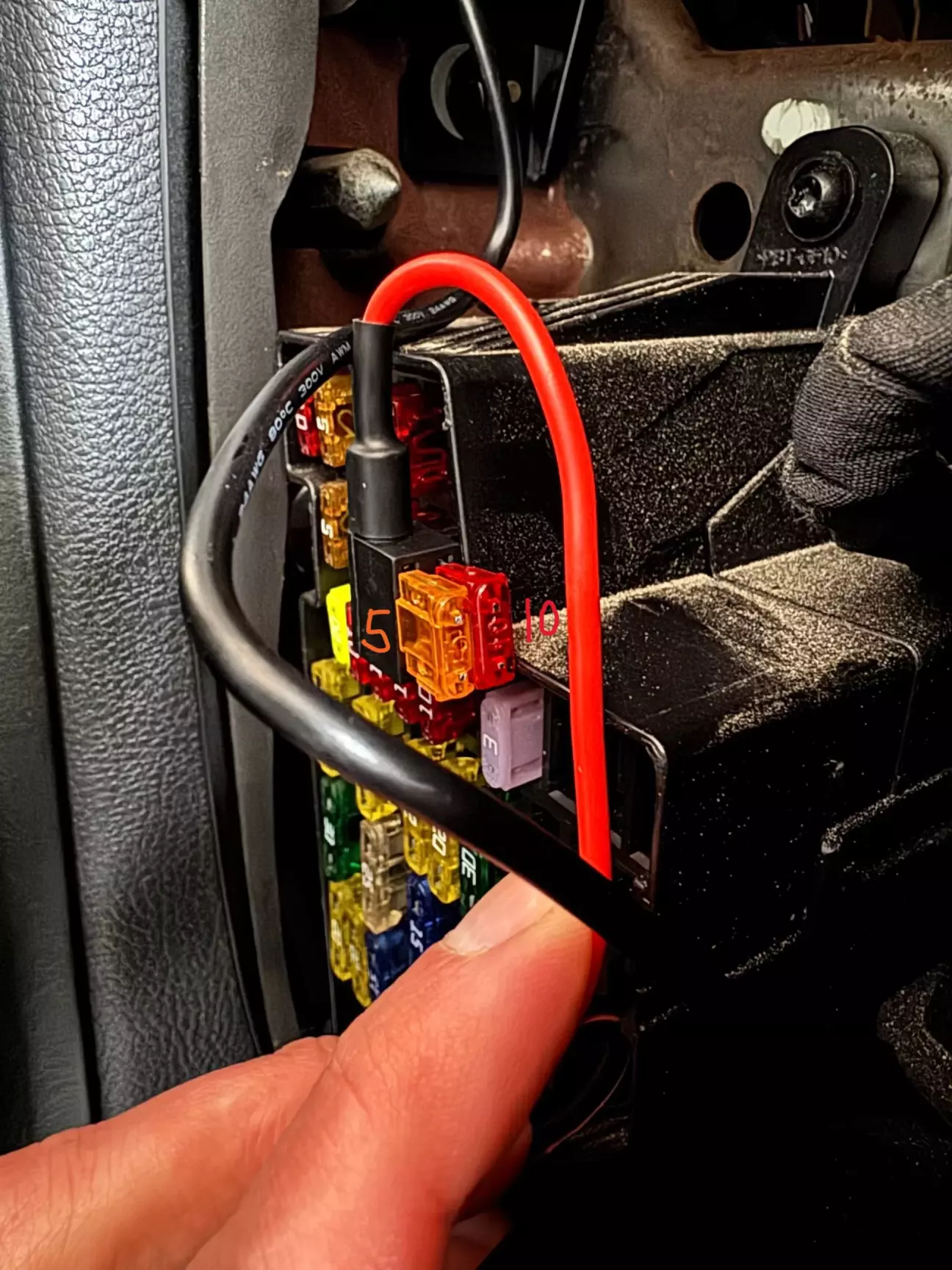 Запобіжник ближче до вусиків 10А, це запобіжник від якого ми заживлюємося, а другий 5А відповідно запобіжник прикурювача.