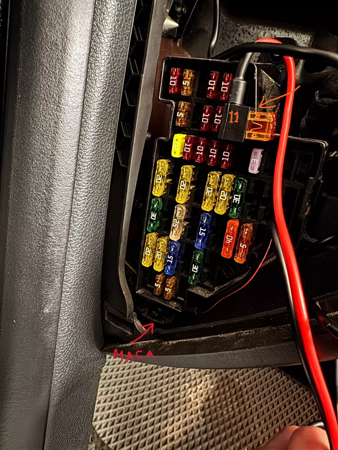 Під'єднуємо живлення. Нас цікавить запобіжник під номером 11. Він вільний. Напруга на ньому з'являється при ввімкненому запаленні і відповідно зникає коли запалення вимкнене.