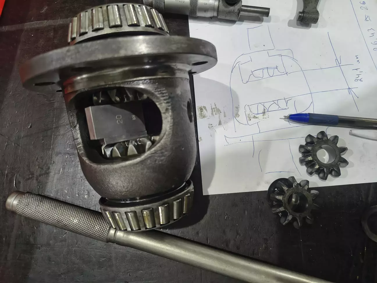 Принцип його дії полягає в тому, що між шестернями півосей в коробці диференціалу, розміщується дві пластини, які розжимаються пружинами і за рахунок збільшених сил тертя, як між самими великими сателітами, так і між сателітами і корпусом диференціала отримаємо більш жорсткий зв'язок між шестернями півосей. Наскільке це рішення довговічне, час покаже, а поки готуємо все під встановлення цього девайса. Згідно інструкції виробника, зазор між пластинами і великими сателітами має бути приблизно 0.1 мм. Вимірюємо зазор, який є зараз і вираховуємо скільки металу потрібно зняти з кожної шестерні.