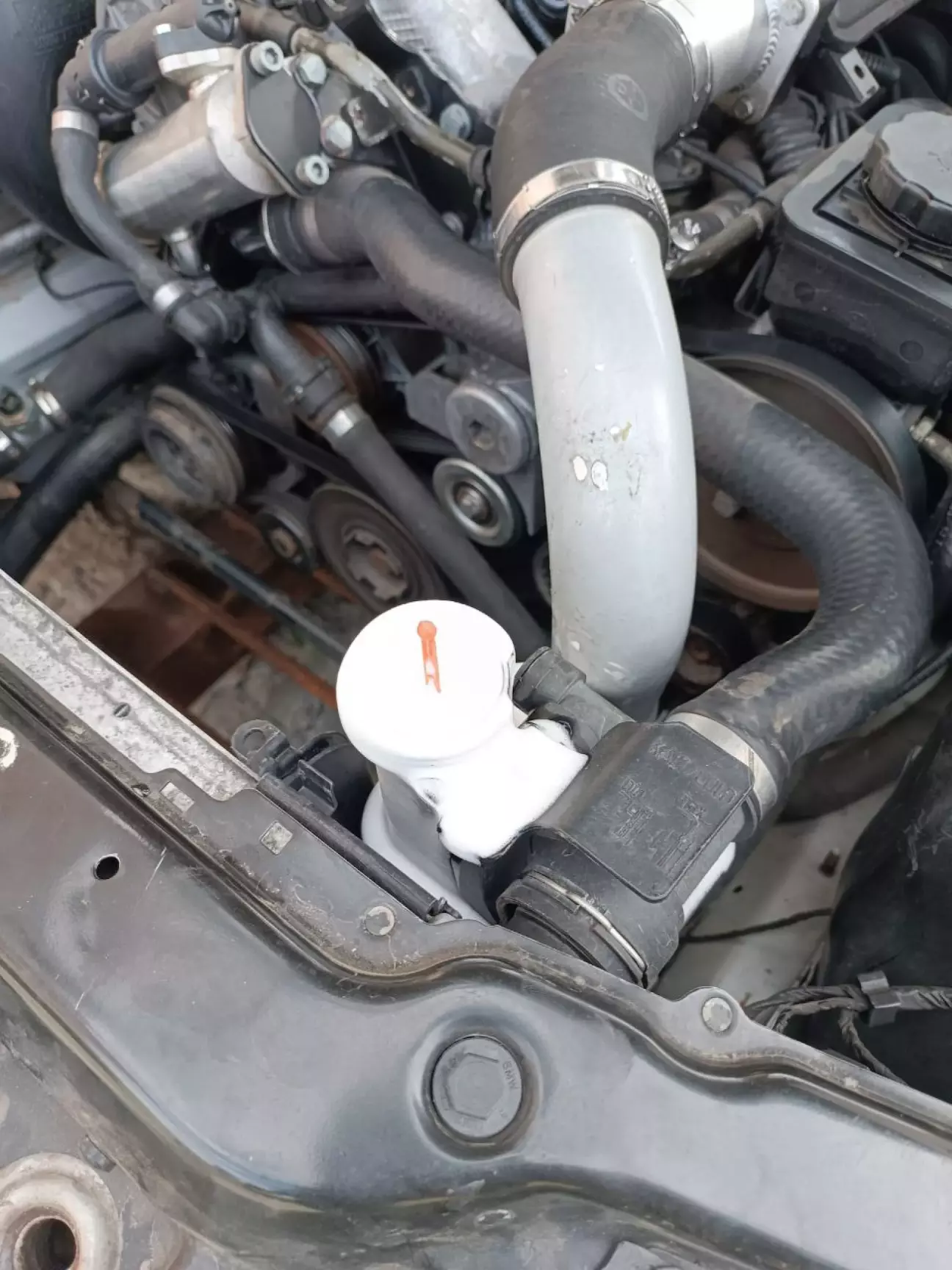 Вже не пам'ятаю звідки саме там потекло, щось зі стиків патрубків було. Причиною стала кришка розширюючого бачка. Бачок вже був міняний до мене. Стояв від Meyle. Кришка розпалася на ві частини. Різьба лишилась в бачку, клапан в руці. Тому замовляємо другу оригінальну запчастину)))