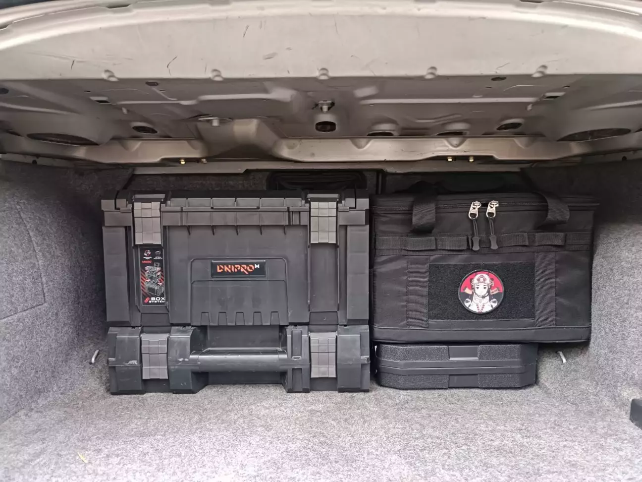 Щодо оганізації необхідних мені речей. Не можу в подорожі їздити з пустими руками. Це стосується тросів, кабелів для прикурювання, дрібних інструментів, рідин. Не подобається коли все розтикано по усім дірам в багажнику. Ще маю рису характеру бути монобрендовим. І який народний інструмент сьогодні важається в Україні?) Правильно, як на мене, це Dnipro-M) Вподобала їх S-Box система, придбав чемодан з ящиком де усе зберігаю. Плюс ми з дівчиною полюбляємо кемпінги, а іноді неочікувані кемпінги. Замовив на AliExpress сумку-чемодан де зберігаємо усе. Від пальників, до чаїв з гамаками. І під цю сумку добре стає чемодан з інструментами від Dnipro-M або Intertool, вони в розмірах однакові.