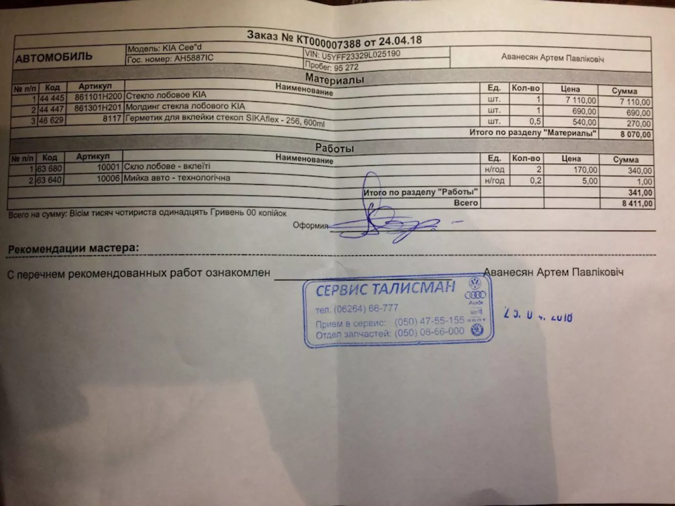 Заменил вот 24 апреля лобовое стекло. На старом пошла трещина. Удовольствие не из дешевых. Были аналоги за 2500 и 4000 грн, но это не "путь Джедая". Я решил — буду ставить оригинал. 7110 грн такое удовольствие + побочные траты в виде молдинга (690 грн), герметика (540 грн) и т.д. В сумме чек на 8411 грн.