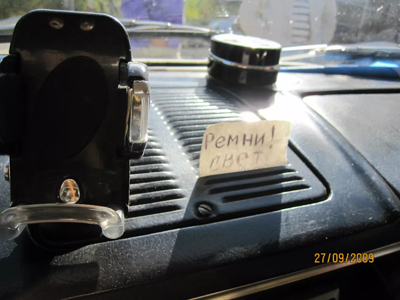 Когда браток добрался до Киева, первым делом поехал его встречать. Он уже стоял в ангаре и ждал меня. Открыв дверь и сев за руль, я понял, тут ни чего не изменилось, все как было при Андрее, не хватает только стикера из первого пробега, когда мы въехали в РФ, где нужно пристёгиваться и включать свет)) Андрей сделал себе напоминание прямо на торпеде)) ещё там была голубенькая Нокия)) она тоже займёт своё место