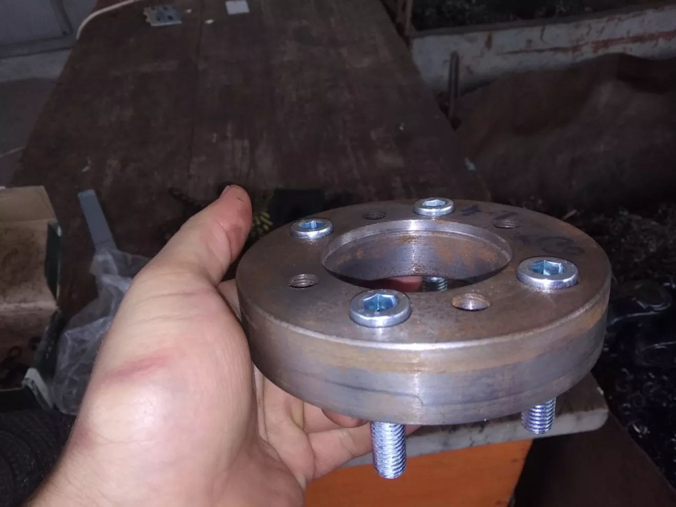 Я намерял что кардан должен быть длиною 570 мм, то мне нужно сщитать так: 570-90=480 мм, получается растояние от крестовины к крестовине, тогда чтоб узнать средее положение кардана надо отнять 40 мм 480-40=440мм, далее смотрим каталог уазовских карданов и находим: "Для автомобилей на мостах Спайсер с четырехступенчатой коробкой передач, каталожный номер 3160-2203010 : в статическом положении — 438 мм, в вытянутом/сжатом состоянии — 483/428 мм", собственно он и был заказан, и у токаря был заказан фланец переходник чтоб не пересверливать фланец на раздатке.