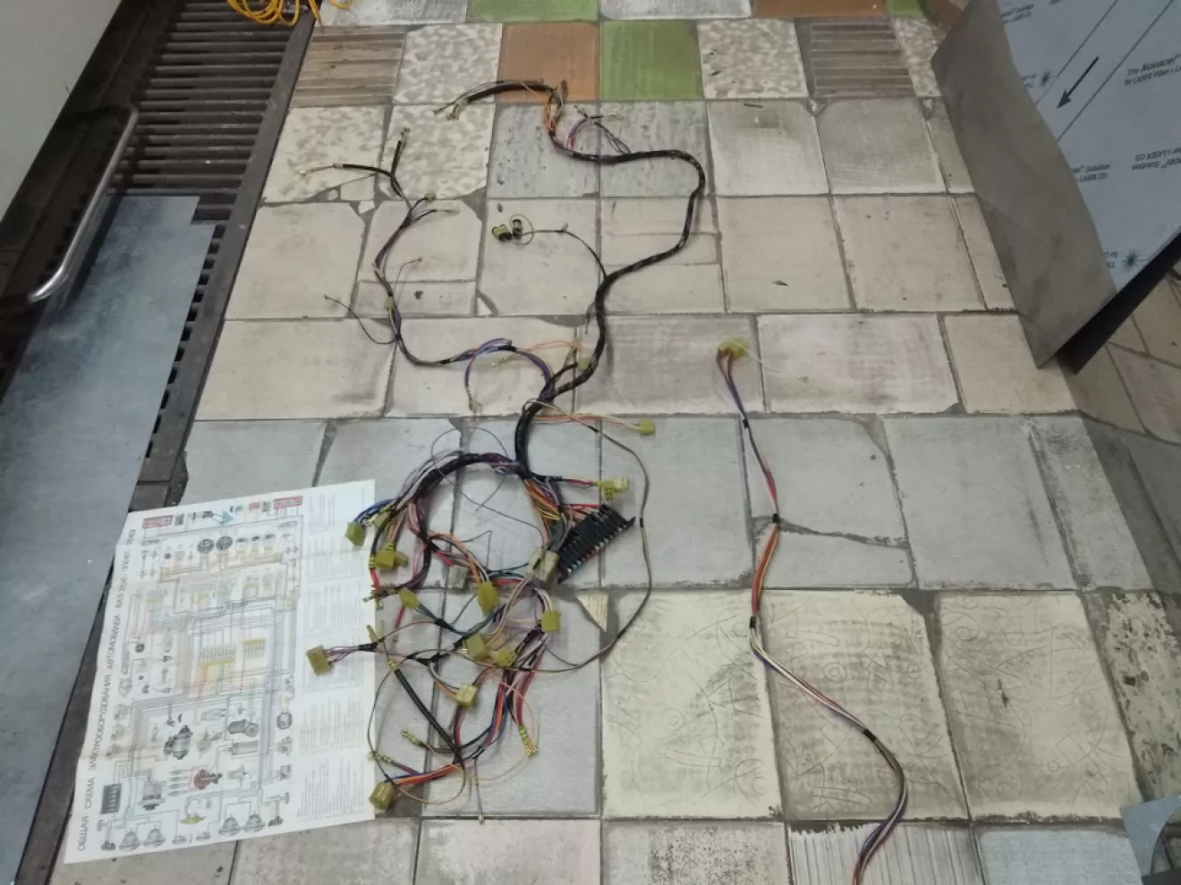Проводка была куплена… но что с ней делать ума не прикладывал… но глаза боятся а ум и руки трудятся, Была найдена толковая схема в инете (большынство схем в инете с ошибками в описании названий) … и принялся поскладывать на земле и согласно схемы каждый провод подписывался что куда идёт … потом потихоньку начал укладывать на автомобиль … продолжение следует …