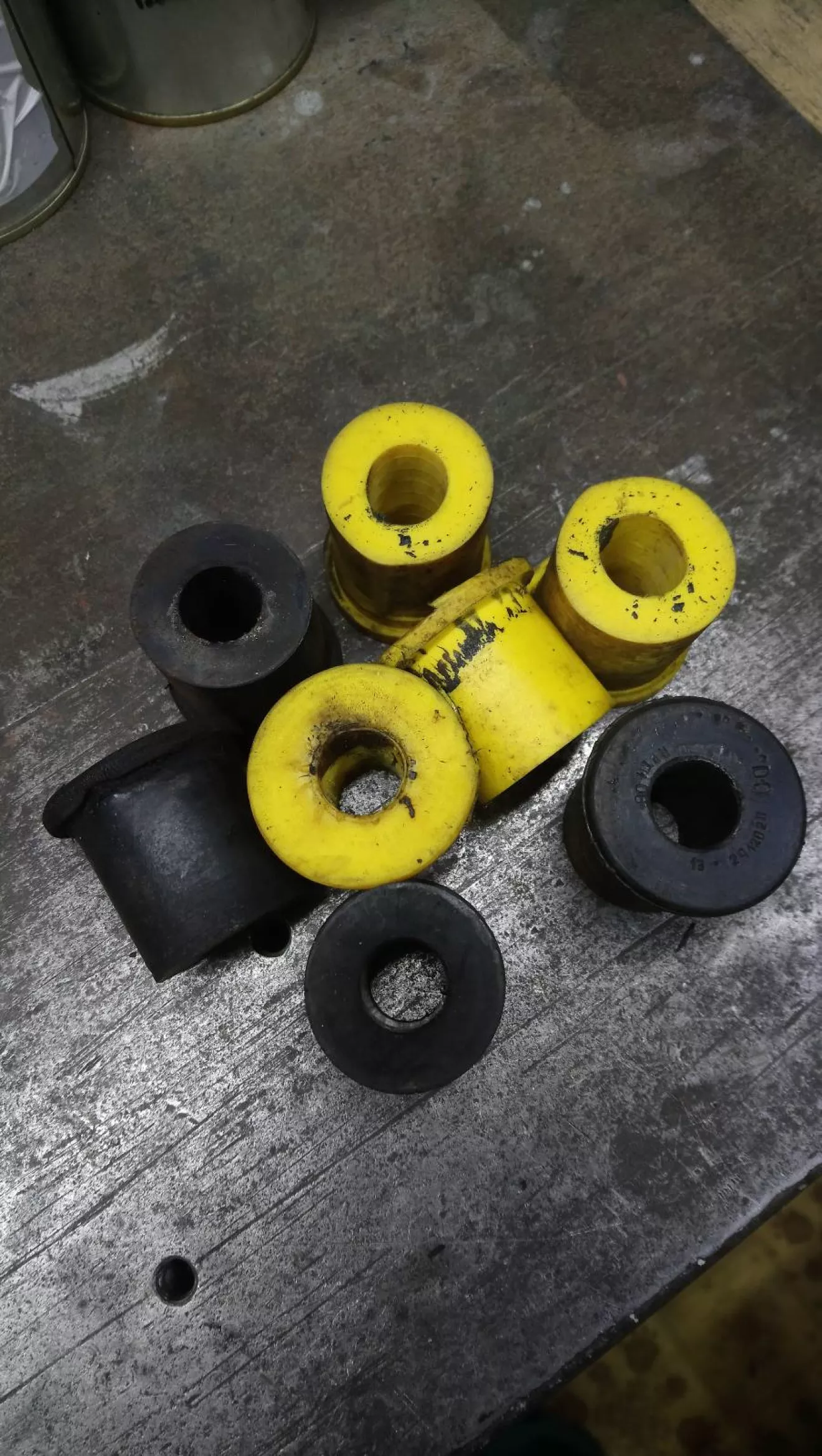 Втулки рессор для сравнения поставил разные: верхние заводские, а нижние желтые типа полиуретановые с авторынка Перова — желтые полное барахло: задубели, выработались, начали скрипеть. Уже жалею, что поставил их в 21-ю в переднюю подвеску. Заводские резиновые практически без следов износа, но все равно поставил новые раз уже начал замену.
