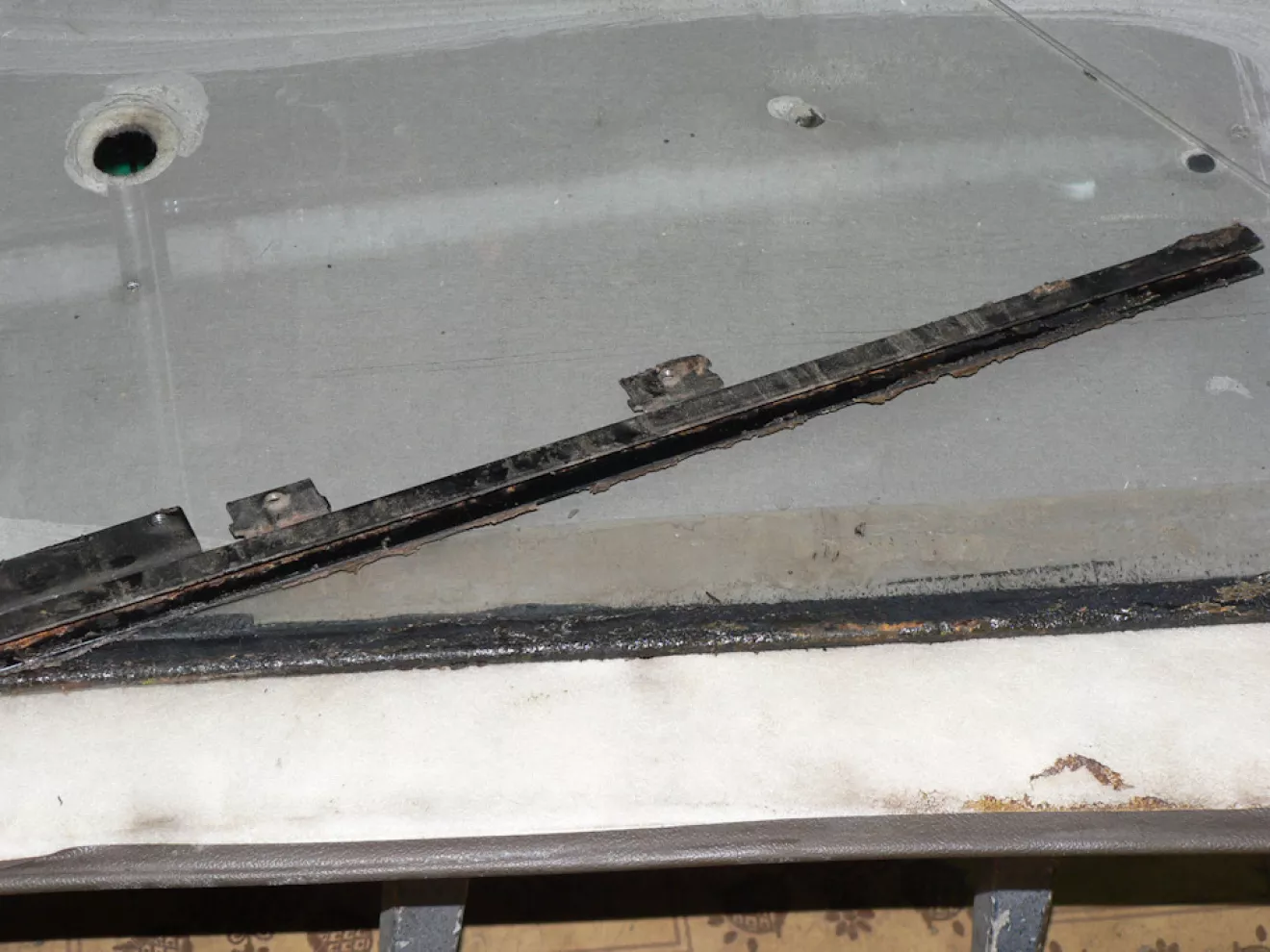 Процесс все тот же: очищаем стекло от сырой совковой резины, желобок (кстати в очень приличном состоянии вплоть до наличия заводской краски), обезжириваем, потом праймер и герметик — он же стекольный клей.
