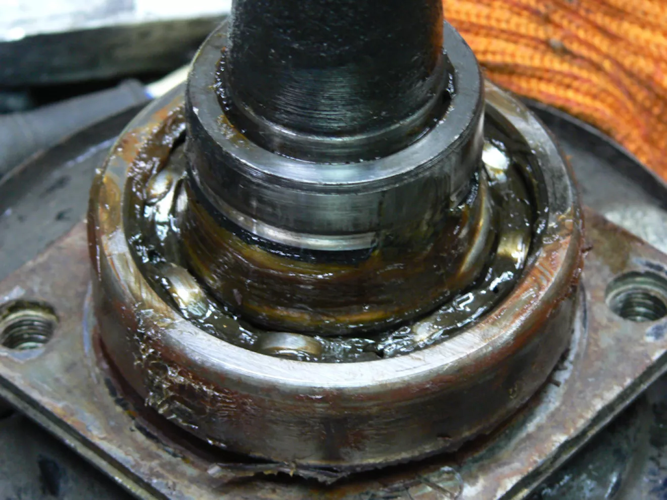 А сегодня уголек опять в стойле на рабочем месте. В процессе разборки был обнаружен и осевой люфт почти 1 мм и полное отсутствие регулировочных колец да и сальник полуоси был недосажен. На запорном кольце видно след от осевого люфта. Кольца использую от маслосъемных наборных 92 мм с небольшой подрезкой по диаметру. То ли после смазки то ли после езды на кривом колесе, но полуось пришлось заменить. Все что ни делается — все к лучшему.