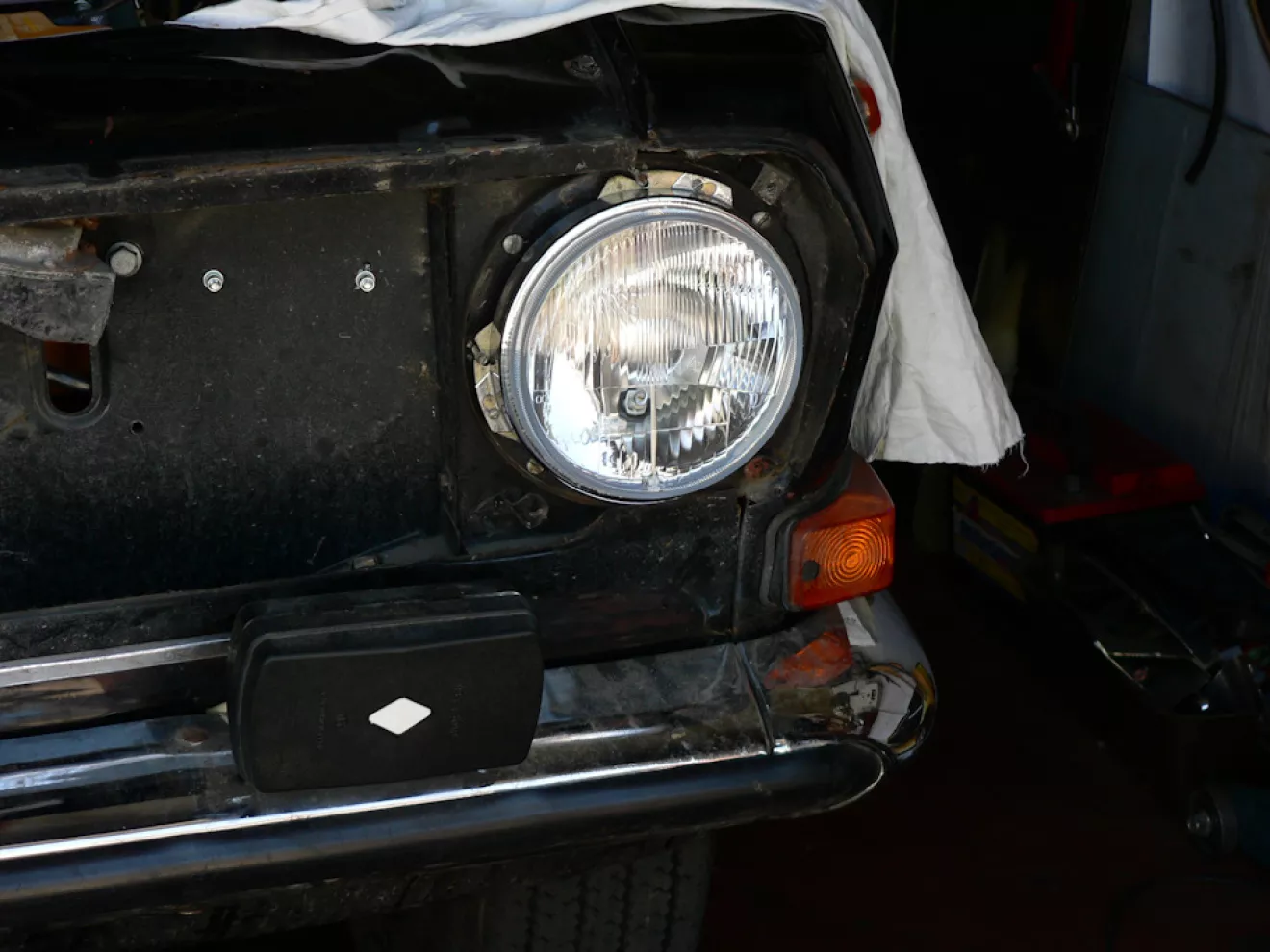 — заменили оптику на Wesem, обнаружили поперечный жгут в жалюзях радиатора — сделали зацепы, закрепили