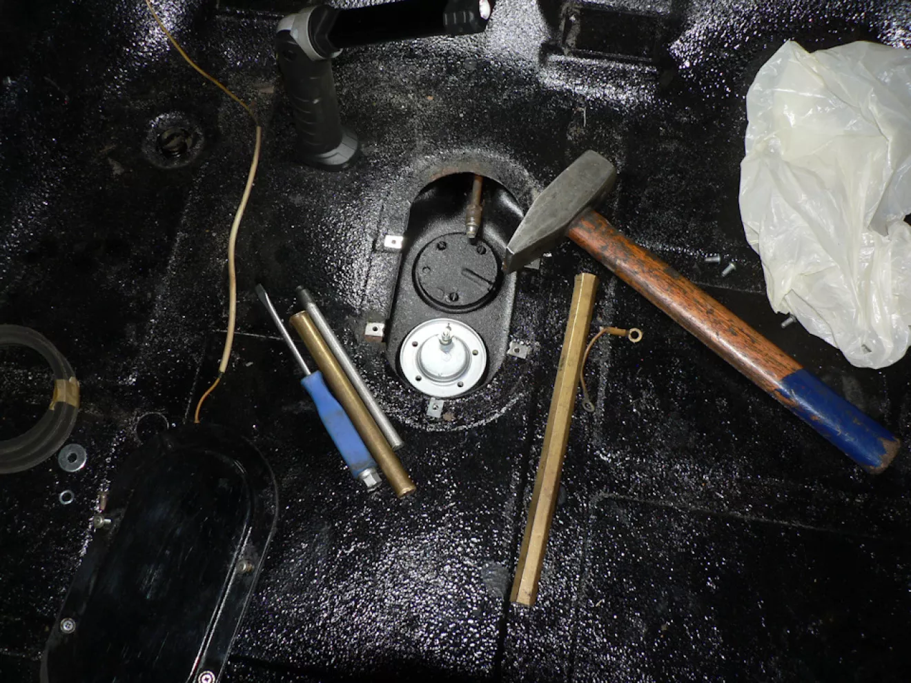 — старый топливозаборник выдрали уже чисто из принципа взглянуть на него и понять почему новый не становится на место, хотя он и сильно устал, но ещё работал — завтра все равно обрежу новый и, как обычно, закреплю болтами из нержавейки под головку торцевого ключа