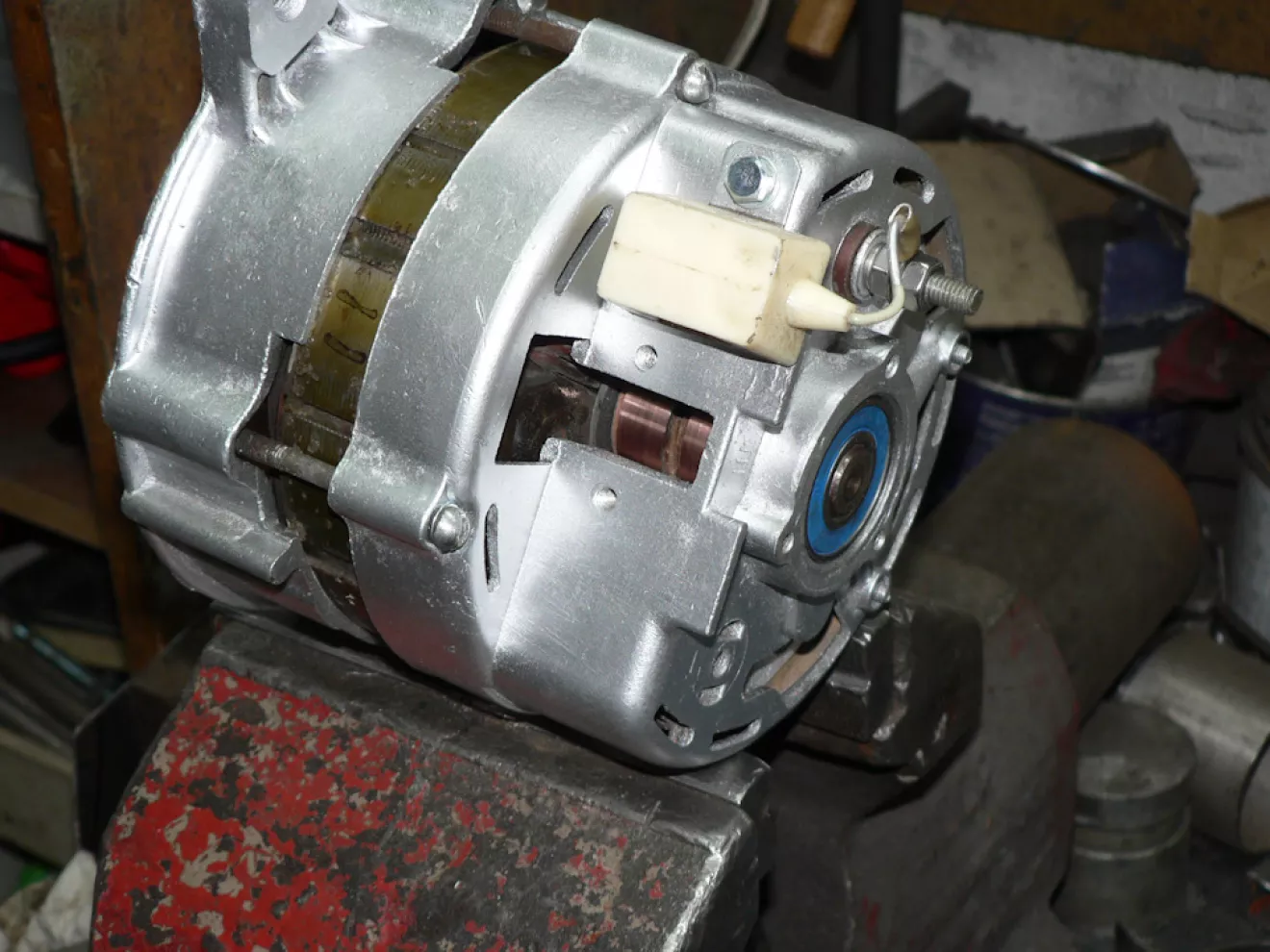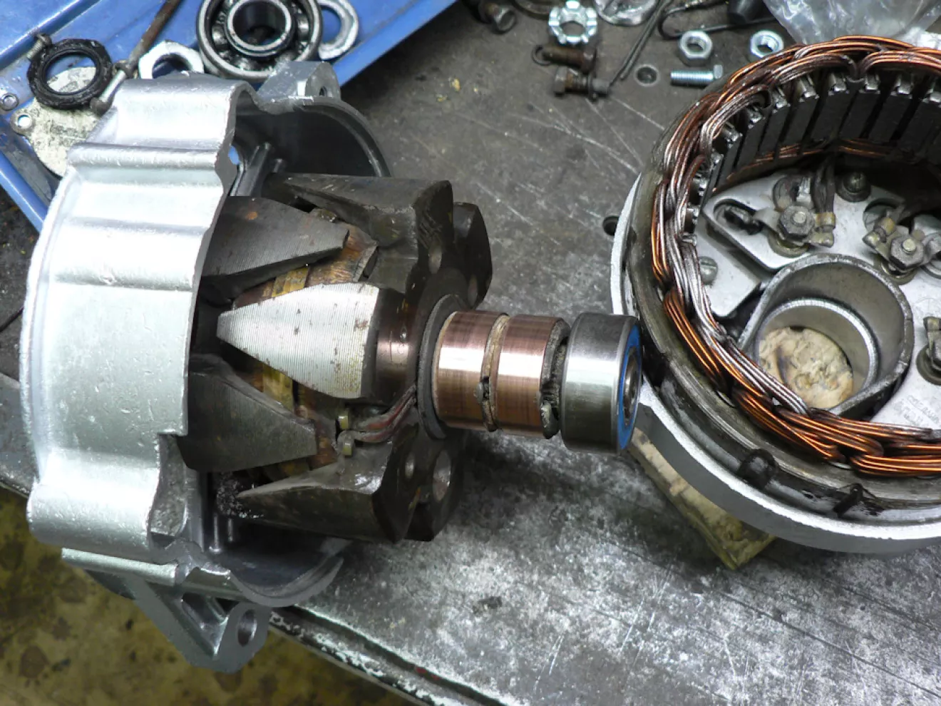 Небольшой шум генератора был не очень критичен, но было бы глупо не воспользоваться ситуацией и не посмотреть, что у него внутри. По состоянию колец ротора можно сказать, что он почти новый и если даже хозяин и скрутил спидометр на 30 тык, то не так и много. А вот подшипники с задубевшей совковой смазкой 90-го года решил заменить на новые — так будет спокойней.