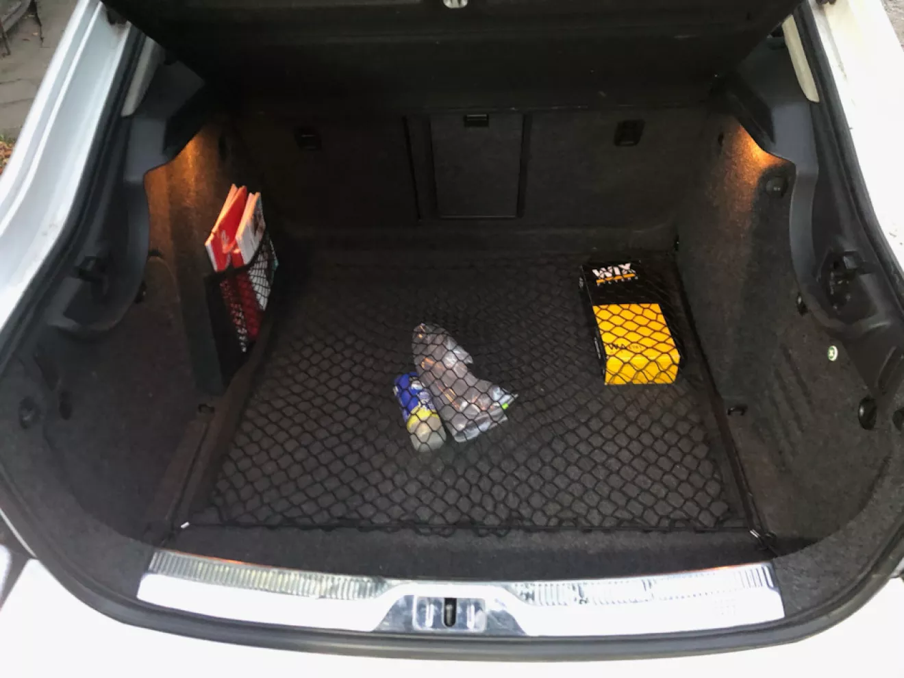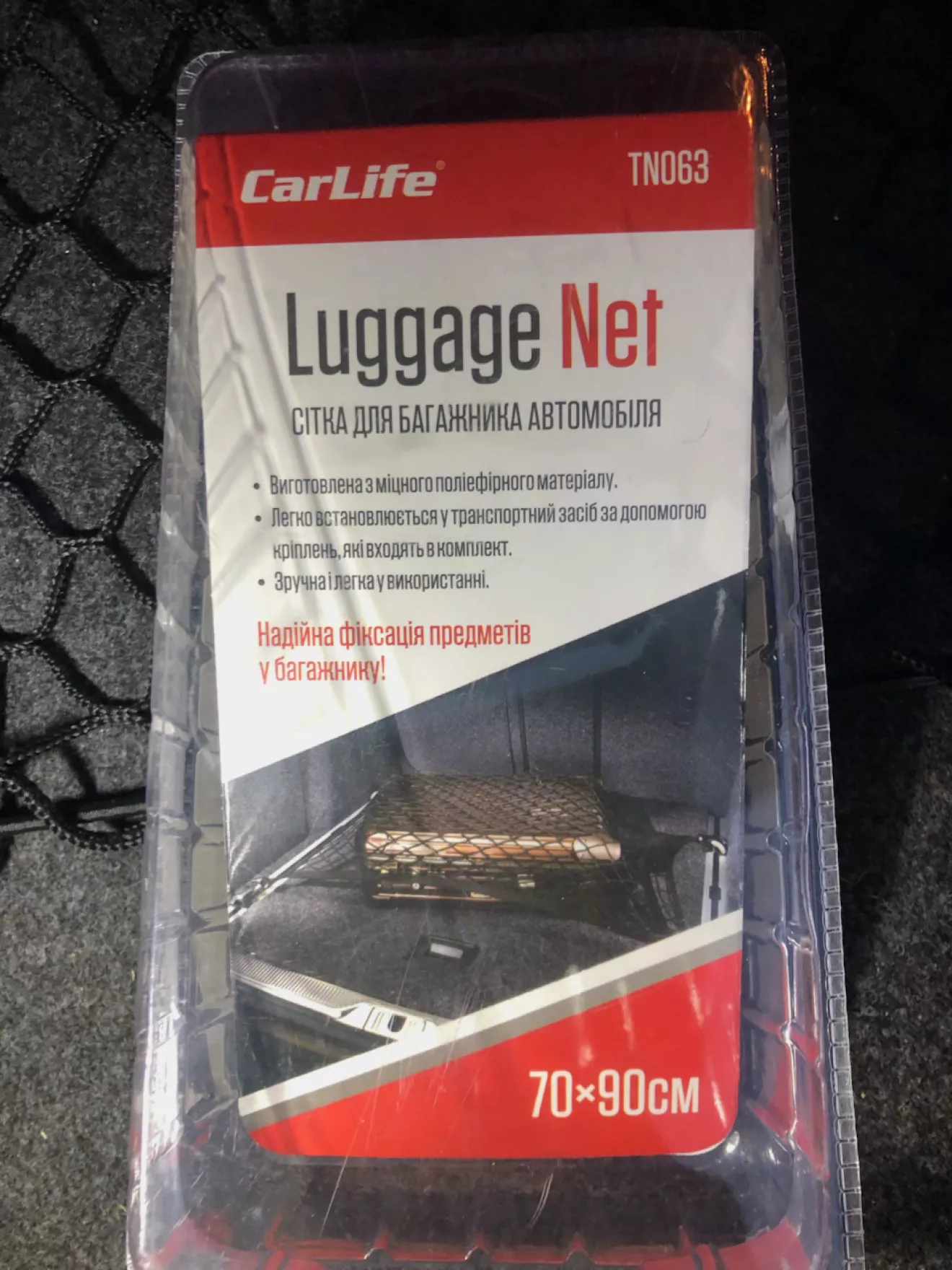 — сетка в багажник, размер: 70*90см. Цена — 200грн. Подошла хорошо, крепится на карабины к родным собам багажника.