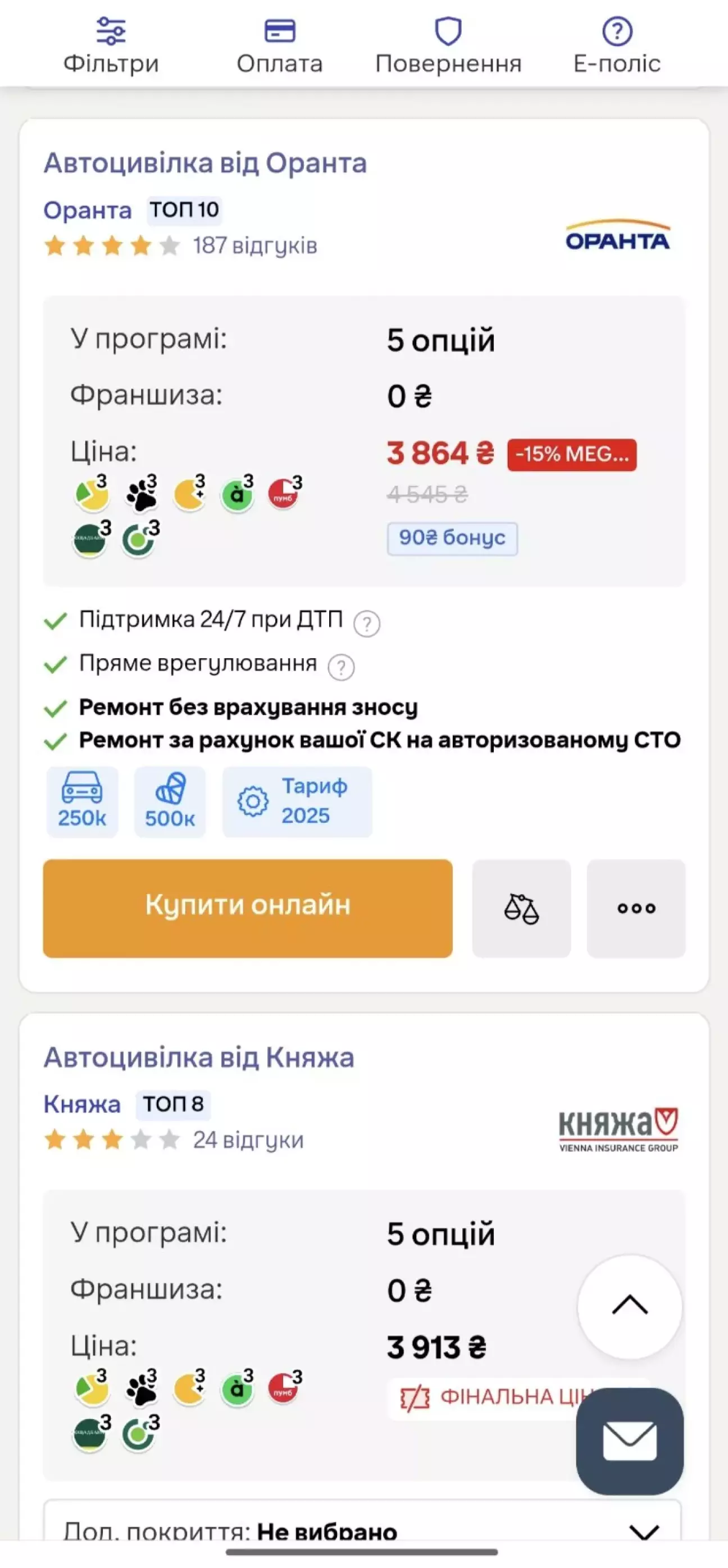 Зайшов на хотлайн фінанс заповнив всі дані по автівці, знайшов свою контору і вів промокод на 15% знижки. І здивувався ціна на 600 грн. більша ніж у мого агента. Вона озвучила прайс в 3250грн. Тому обравши там де дешевше пішов до Оранти. Там все по стандарту. Отримав паперовий поліс і європротокол плюс файлик) Також поліс прийшов і на електронку.