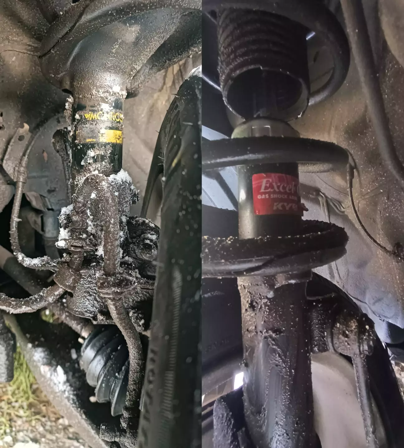 Заїхав поміняти масла/фільтра, заодно на діагностику підвіски, бо гупати почала досить сильно, пробивало в відбійник. Приговорили сайлентблоки, стойки амортизатора, колодки і відбійники. Це все по передній осі. Жопа без нарікань. У мене все стильно модно - права передня стойка Каяба, а ліва передня - Монрошка.