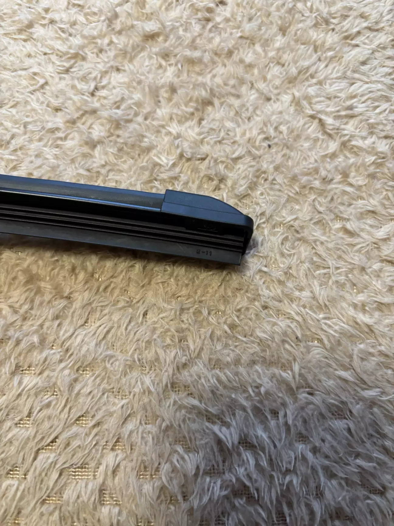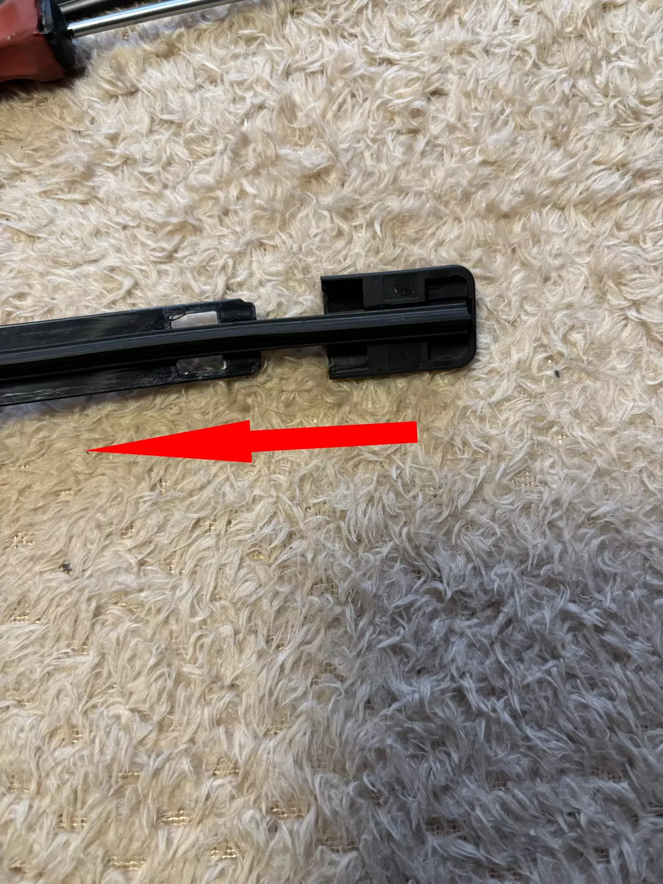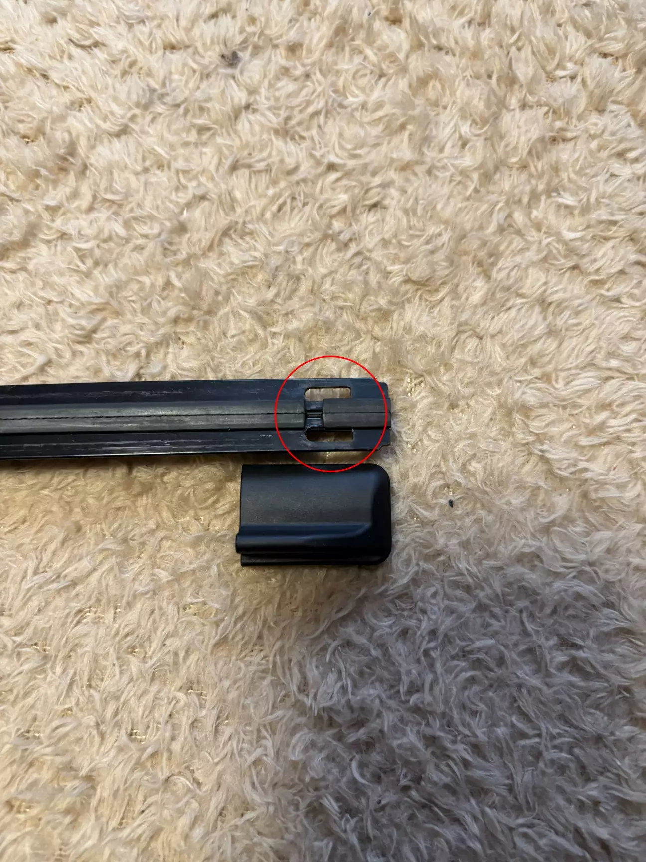 Це говорить про те, що саме з цієї сторони одягати ковпачок потрібно разом з гумовим елементом, підтягуючи останній вздовж направляючих металевих пластин. Бо якщо одягати ковпачок на вже готовий виставлений гумовий робочий елемент, ковпачок просто-напросто його заломить. Тобо робочий елемент буде деформований і відповідно протирання скла буде з розводами.