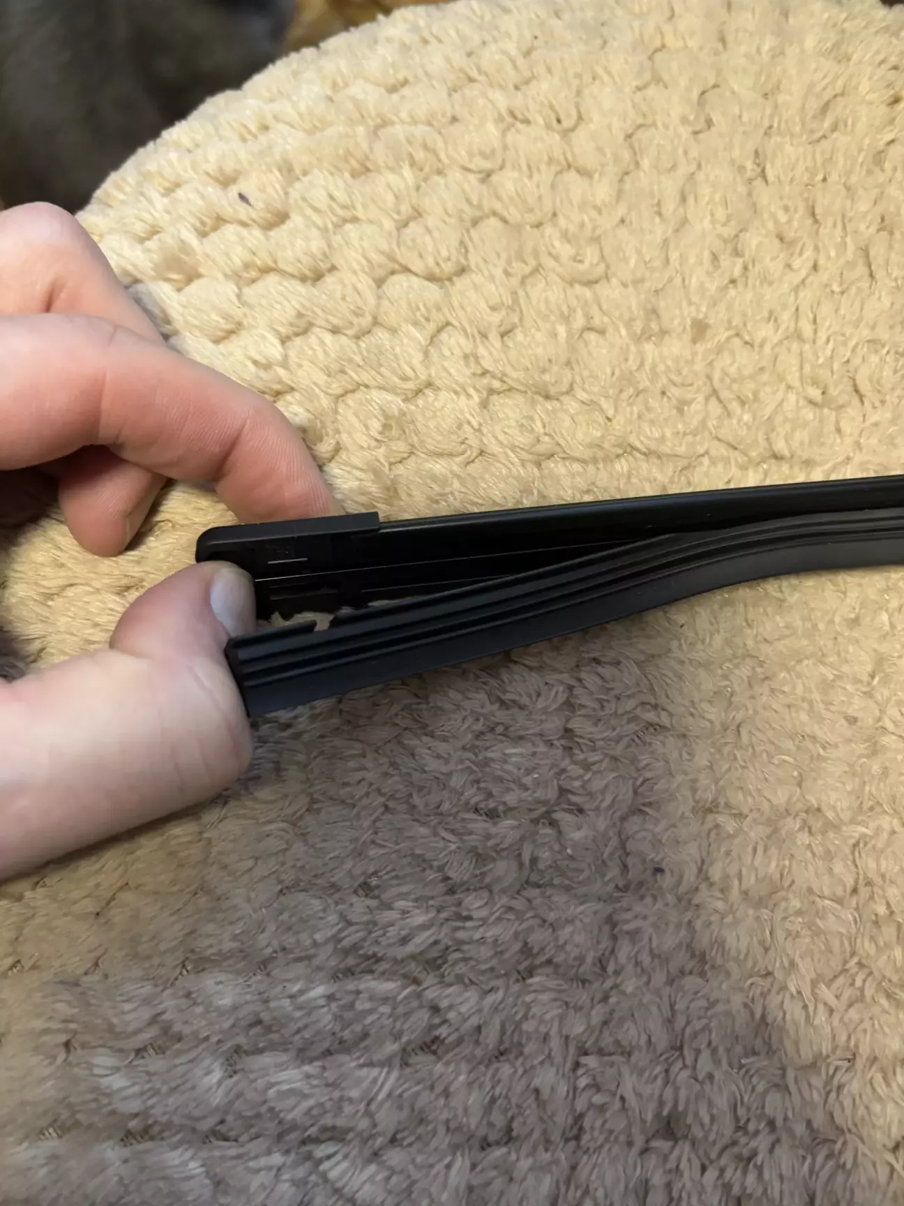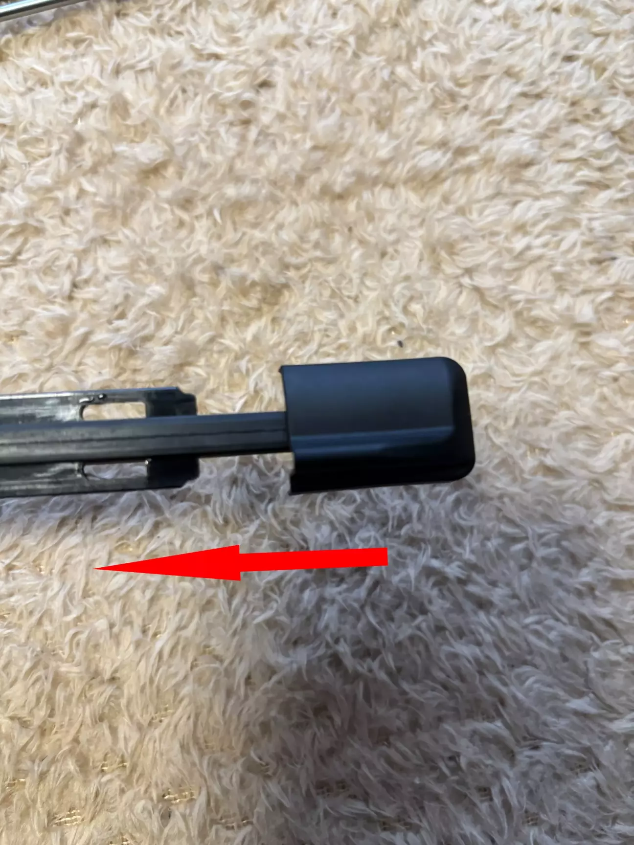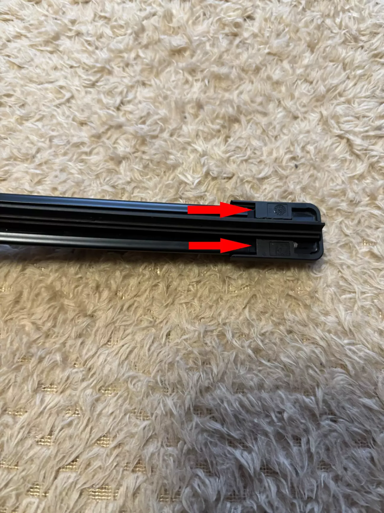 Це говорить про те, що саме з цієї сторони одягати ковпачок потрібно разом з гумовим елементом, підтягуючи останній вздовж направляючих металевих пластин. Бо якщо одягати ковпачок на вже готовий виставлений гумовий робочий елемент, ковпачок просто-напросто його заломить. Тобо робочий елемент буде деформований і відповідно протирання скла буде з розводами.