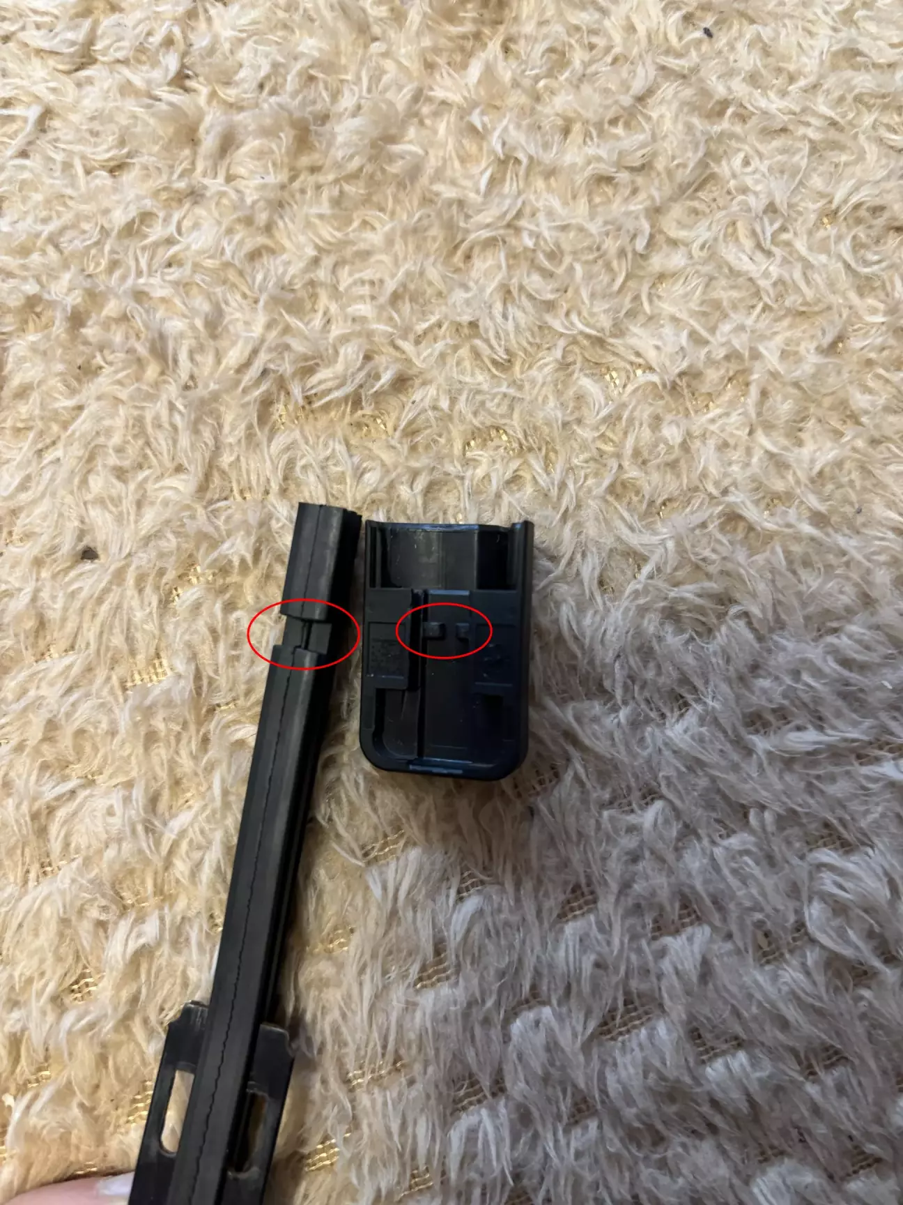 Далі вирівнюємо гумовий робочий елемент між металевих пластин. Але тут є один важливий нюанс, якщо читали уважно, то я писав, що щітка має початок і кінець. Якщо звернули увагу на фото, гумовий елемент має виріз біля отворів на металевих пластинах. Це говорить що це початок щітки, бо в кінці даного вирізу немає... Саме цей виріз має чітко співпадати з виступами на ковпачку (див фото нижче):