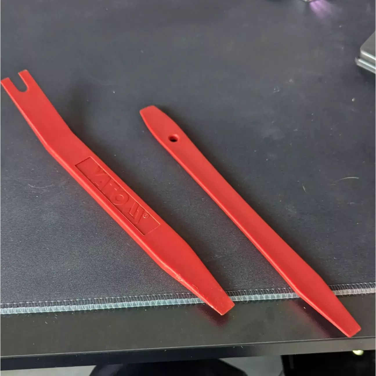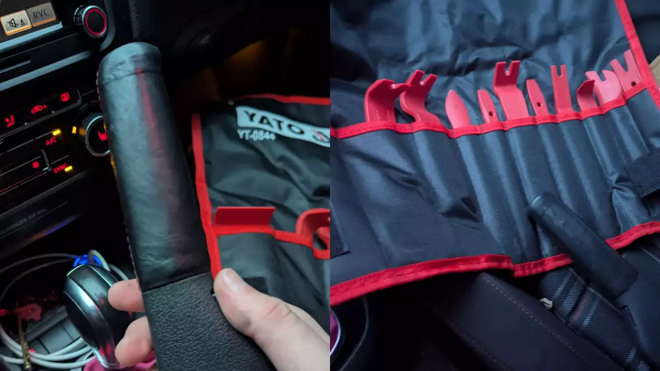 Підготовка руля була окремим квестом. Я ніколи в житті не розбирав руль. Взяв пластикові знімачі і почав дуже обережно знімати старий декор. Він тримається на литих алюмінієвих защіпках, які дуже міцно сидять у прогумованому корпусі руля. Головне правило тут одне - не тягнути з одного боку. Якщо тягнути нерівномірно, защіпки можна зламати навіть попри те, що вони металеві. Все знімав повільно і рівномірно.